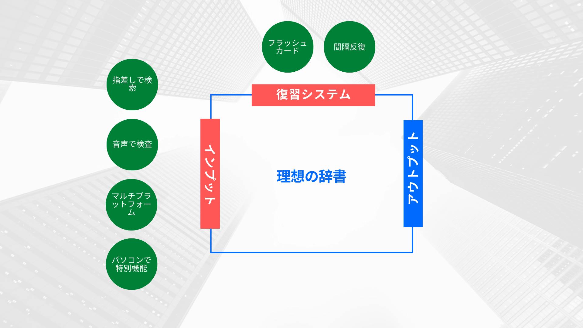 そこで私は、今の自分にとって「理想の辞書」を開発しています。 インターネット上にある普通の辞書に比べてなにが違うかというと、単語を調べる方法学習システムです。 今までの辞書の調べ方はテキストだけでが、調べたい単語は本の中人間の音声など様々な場面で出てきます。そこで、私は最新技術を利用して辞書の調べ方をもっと便利にしたいです。 それだけでなく、ユーザーが検索した単語を忘れないように、間隔反復の学習方法を利用した復習システムも実現していきたいです。