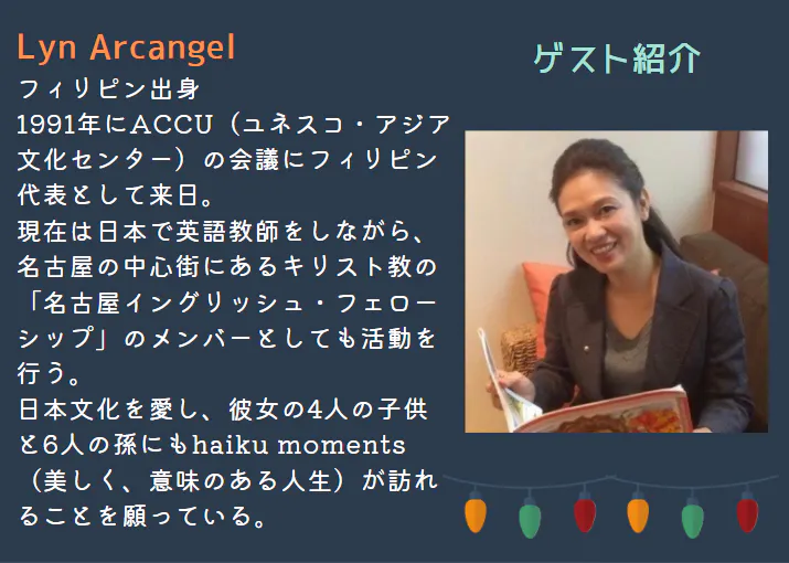 名古屋にお住まいのフィリピン人、Lynさんをゲストに招待して、フィリピンのクリスマスの過ごし方についてお話いただきます。