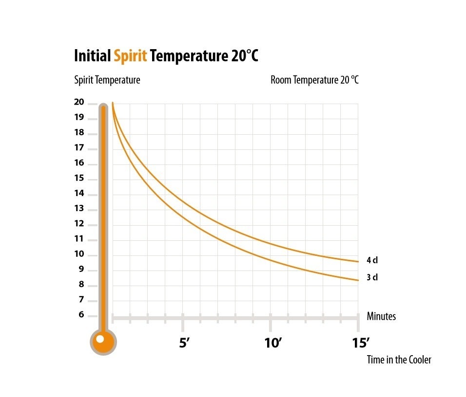 最後に、お好きな飲料をコルクのあるところまで(40ml)注ぐと、ストーンがスピリッツクーラーの役割をはたすので、ドリンクの温度が常温から1分ごとに約1.5℃ずつ温度が下がっていきます。