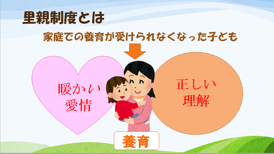 さまざまな理由で親と暮らせない子どもたちを家庭環境の下で養育する制度です。家庭での生活を通じて、子どもが成長するうえで極めて重要な特定の大人との愛着関係のなかで、養育を行うことにより子どもの健全な養育を図ります。