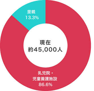 親と一緒に暮らせない子どもたちを公平な責任のもとで社会的に養育することを、社会的養護といいます。社会的養護の子どもたちは、現在の日本に約45,000人。そのうち約39,000人が、乳児院や児童養護施設で集団生活をしています。里親家庭で暮らしている子どもたちは約6,000人です。まだまだ里親さんは足りていません。