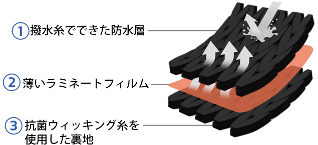 ②薄いラミネートフィルムが外側にかかる水圧から守り、内側からの蒸れや熱を吸収し外側の層に排出します