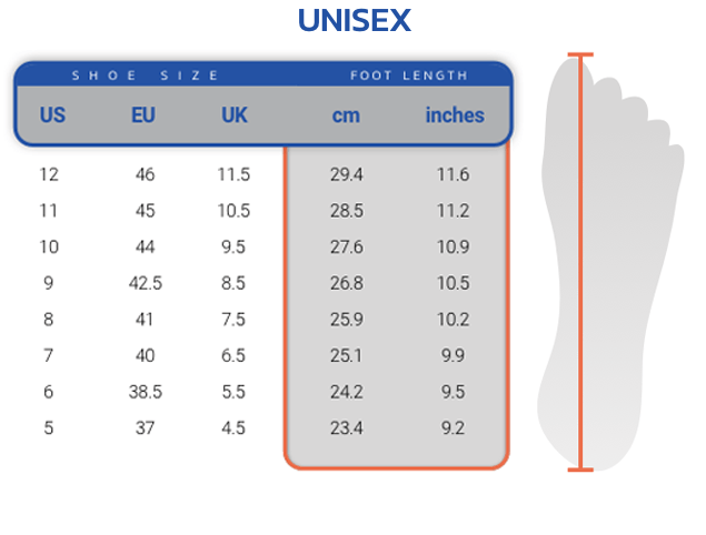 自分に合ったサイズを注文するには、かかとの後ろからつま先の先端まで足を測ります。次に、以下の表で最適なサイズを探します。足のサイズが2つの数字の間にある場合は、通常は足に余裕を持たせる方が良いため、大きい方のサイズをお勧めします。