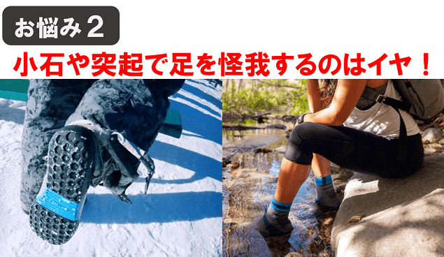 今までのくるぶし丈のアウトドアシューズでは、靴の中に砂や水、雪が入ってきました。せっかくのアウトドアも、靴の中が濡れていたら気持ち悪い…