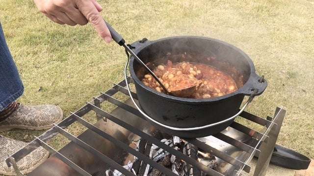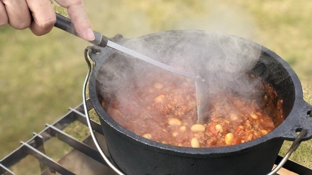 BurnMoreはダッチオーブンが2個乗せできる焚き火台です。熱々のチリコンカン。
