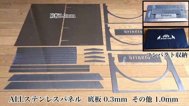ステンレスのプレート組立式で収納時の厚さは20mm以下。キャンプの道具は多いですが荷物のちょっとした隙間に収納できます。