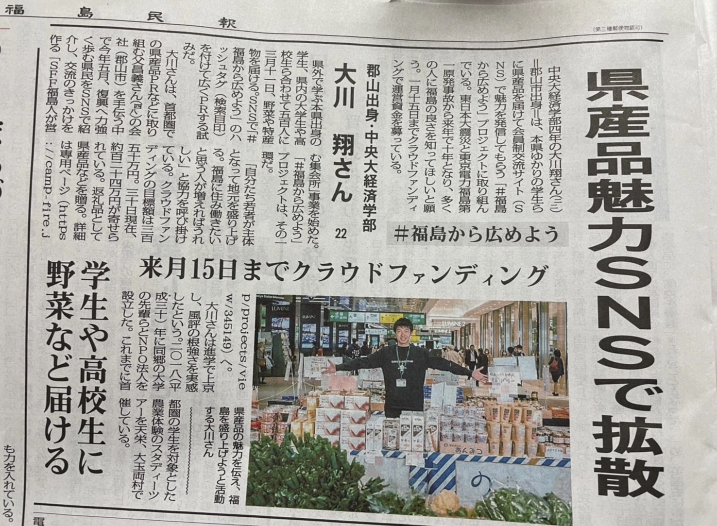 こんにちは!SFF発起人 福島を変革する男 大川翔です。今回から少しずつSFFの運営メンバーを紹介していきます!今日紹介するメンバーは、郡山市出身の3名の大学生です!それぞれ違った想いを持ってSFFに関わってくれています。ぜひ、見てみてください!!ーーーーーーーーーーーーーーーー▶︎歌川充貴(通称:みつき)(郡山市出身 明治学院大学 4年生)■SFFでやっていること主にTwitterのアカウントを運用しています。みなさんのいいねやRTがとても励みになっています!■福島への想い今の自分が形成されているのは間違いなく福島で出会った方々のおかげです。そんな福島に恩返しをするためSFFで活動をしています。今回のクラウドファンディングでは「食」を通したその先の「人」までみなさんに知って頂きたいです!▶︎本田大空(通称:たく)(郡山市出身 立教大学 4年生)■SFFでやっていることSFF最初のイベントや内向き(メンバー向け)のイベントを担当しました。福島県の高校生と交流した時、私自身が勇気を貰いました。SFF内でメンバーが繋がったり、関わって下さった方に何かしらの価値を届けられたりしたら嬉しいです。■福島への想い私にとって福島はあたたかい居場所です。いつ帰ってもいつも新鮮で前向きな気持ちにさせてくれます。そんな福島に恩返しをするためSFFで活動をしています。福島のあたたかさに触れて少しでも前向きになってくれる人がいるのなら最高に嬉しいです!▶︎柳沼 万友佳(通称:やぎちゃん)(郡山市出身 立教大学 3年生)■SFFでやっていることSFFでは主にインスタライブを担当しています!ぜひいっしょにお話させてください♪また、インスタライブやこれからの活動を通して、SFF内外問わず人と人とを繋ぐことができたら嬉しいです。■福島への想い福島県の人にこそ福島の魅力を伝えたい!SFFの活動を通して知らない福島との出逢いがあります。あたりまえに生活している場所の魅力に気がつくには、新しいきっかけが必要だと思います。みなさんにとって、このクラウドファンディングが福島の魅力に気がつくきっかけになりますように!ーーーーーーーーーーーーーーーーSFF|福島人が営む集会所のInstagramでは、福島人(福島県民や出身者・福島が大好きな人)を約150名程紹介しております。今日紹介したメンバーも過去の投稿で紹介されています!ぜひ、チェックしてみてくださいね!!▶︎SFF|福島人が営む集会所 Instagram