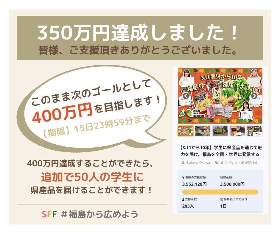 2021/01/15 08:00おはようございます!!SFF発起人 福島を変革する男 大川翔です。まず初めに、ご報告があります。ご存知かと思いますが、支援金額目標350万円を達成いたしました!!皆様、温かいご支援・ご声援ありがとうございます!ここまで約1ヶ月間非常に温かいお言葉をたくさんいただき、本当に嬉しい限りです。しかしながら、まだクラウドファンディングは終わっていません。残り15時間残っています。残っている時間の中で最後まで走りきると決めました。そこで、一つ目標を決めました。それは、支援金額400万円を目指すということです。では、400万円を目指して、どうするのか。それは、福島の学生50名への県産品の提供費用に充てさせていただきます!当初500人に県産品を渡すところをさらに50名増枠して550名に県産品を届けることができます。詳しくは、こちらの動画をご覧ください↓▶︎最後のお願いがあります【Youtube】そして、今回はクラウドファンディング成功がゴールではありません。2021年3月11日には、オンラインイベントを開催する予定です!!その詳細については、プロジェクト終了後にご報告させていただきます。何より、本日15日23時59分まで全力で動いていきます!!何卒、応援をよろしくお願いいたします!! もっと見る