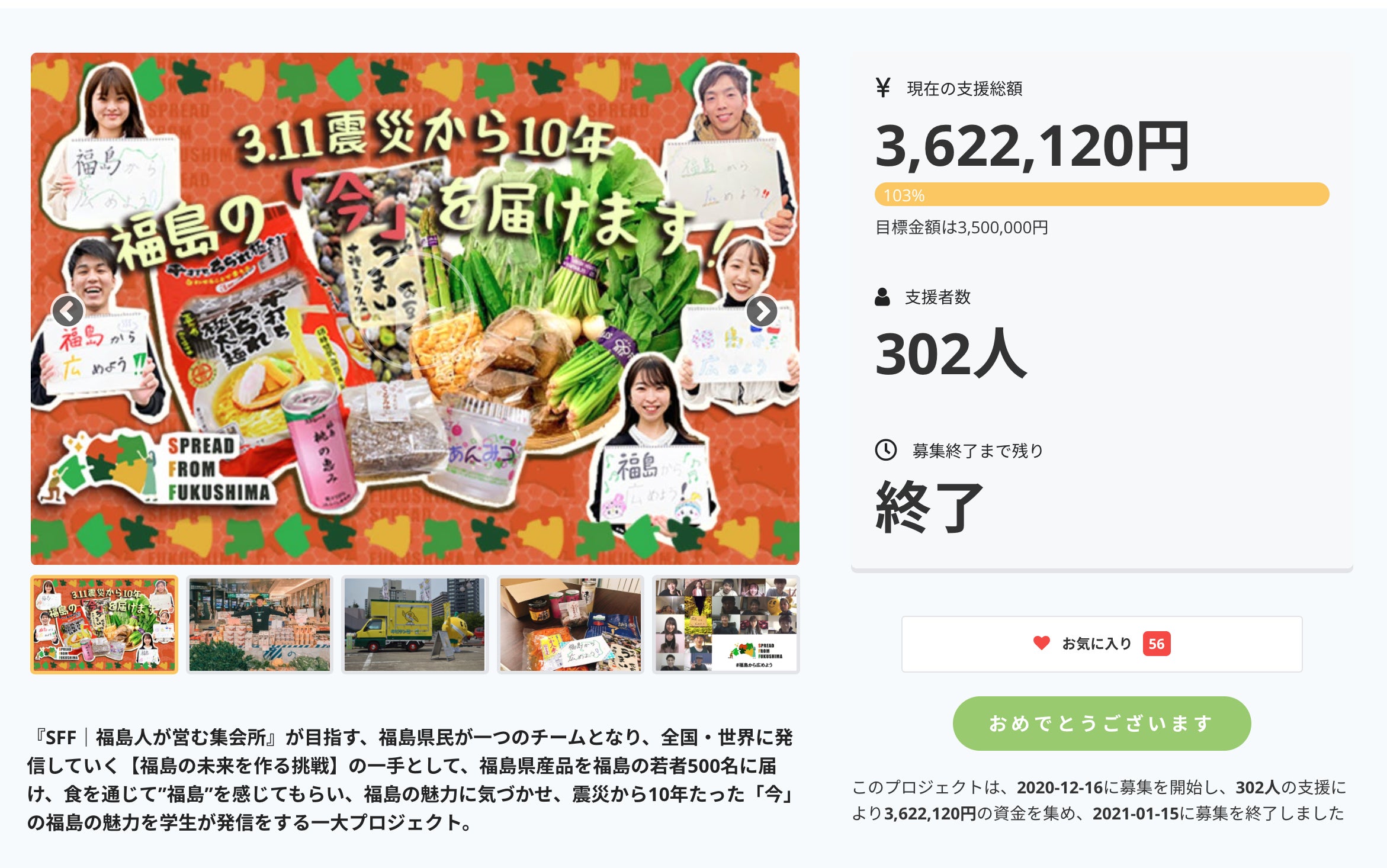 2021/01/16 08:40皆様、おはようございます!SFF発起人の大川翔です。この度は、クラウドファンディングへのご支援をして頂き、誠にありがとうございました。<*リターンの配送に関しましては、順次配送させて頂きますのでお待ちいただけますと幸いです。>私たちSFFは、今回のプロジェクトを通じて、「福島の未来に期待をしてくれている方が302名もいる」ということを知ることができました。この結果を元手に、【福島人を一つのチームのように繋ぎ、全国・世界に発信する福島限定のプラットフォーム】を目指して今後の活動を邁進していきます。そして、何より今回のプロジェクト成功により、大きな「責任感」がつきました。支援者の皆様方と一緒に3.11から10年の2021年3月11日に私たちSFFとしてオンラインイベントを開催させて頂きます。若者を束ね、若者ならではの、「発信」を通じて、福島県の未来に「夢」や「希望」が持てるように、全力でプロジェクト成功を目指します。これは、決して簡単なことではありません。そのため皆様には、今後も引き続き応援していただけますと幸いです。長くなりましたが、約1ヶ月間温かいご支援・ご声援をありがとうございました。これからの『SFF|福島人が営む集会所』の活動報告は、SNS(Instagram)中心に発信していきますので、そちらを見ていただき応援いただけますと幸いです。皆様、本当にありがとうございました。今後ともよろしくお願いいたします。SFF発起人 大川翔 もっと見る【目標金額達成しました!!】皆様ありがとうございます!しかし、まだ終わってません。