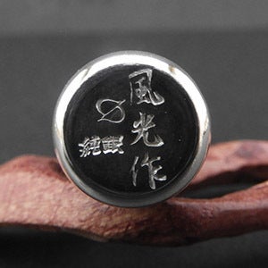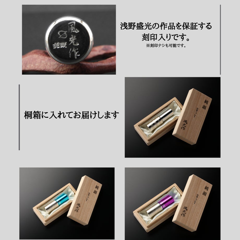 - 製作者号 浅野のアーティストネームです。師匠の「風巖」から「風」の一文字をもらい、本名の「浅野盛光」から「光」の一字を加えて号としています。