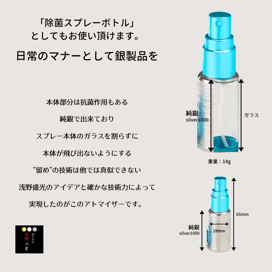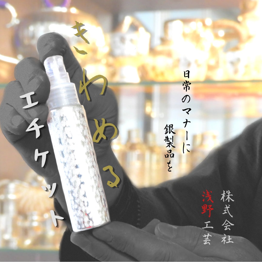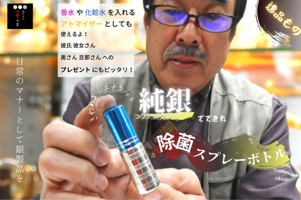 コロナ禍でマスクと同等に求められている除菌。手指を除菌するための消毒液を持ち歩くためにコンパクトで、スプレーとして使う事ができる銀器を開発しました。ガラス瓶の外側から銀をかぶせており、内側はガラス、外側は銀の世界に類を見ないスプレーボトルです。消毒液だけでなく、香水を入れてアトマイザー(香水瓶)として使用する事も出来ます。