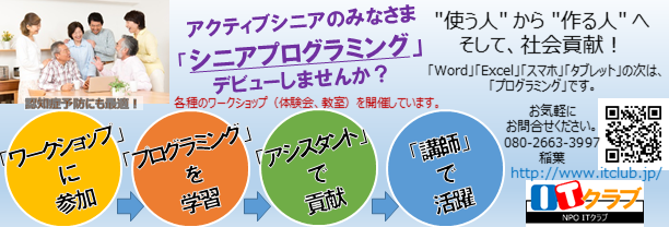 「IT機器の活用」「認知症予防」の観点を超えた、「地域貢献(学校教育支援)」「就業」は、「アクティブシニア」の「生きがい」「生活の糧」となり、少子高齢化の当事者が手を結ぶことで、働き盛りの年代、学校関係者に負荷を掛けずに、次世代を担う子供たちに、最新のIT(プログラミング)技術を体験する機会を提供出来ます。