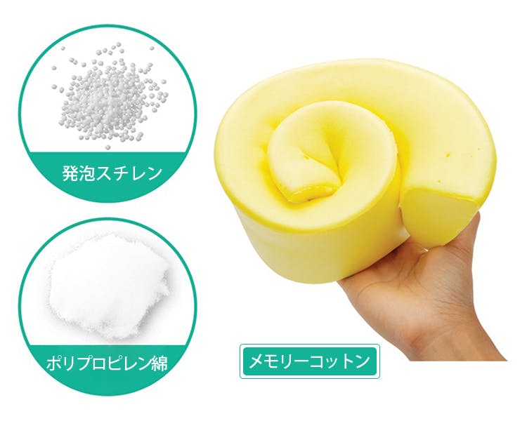 メモリーフォーム(形状記憶素材)で首の稼働に無理なく対応。内部に使用している固め素材が保持力を、外側の素材がクッション性をそれぞれ担っており、首元に巻いても圧迫感が少なく安定感を維持します。