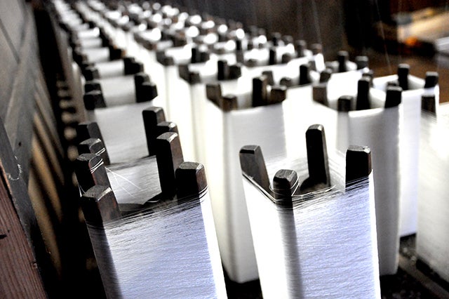 機織り(はたおり)とは、鶴の恩返しのように、タテ糸の間にヨコ糸を入れてパッタンパッタン織物を織ることを言います。業界では経糸(タテイト)、緯糸(ヨコイト)と呼ばれます。