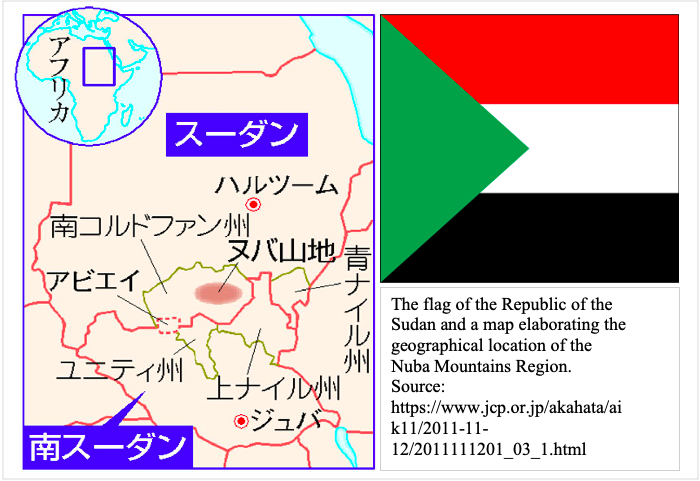 スーダン共和国の旗と詳細にヌバ山地地域の地理的位置示している地図です。