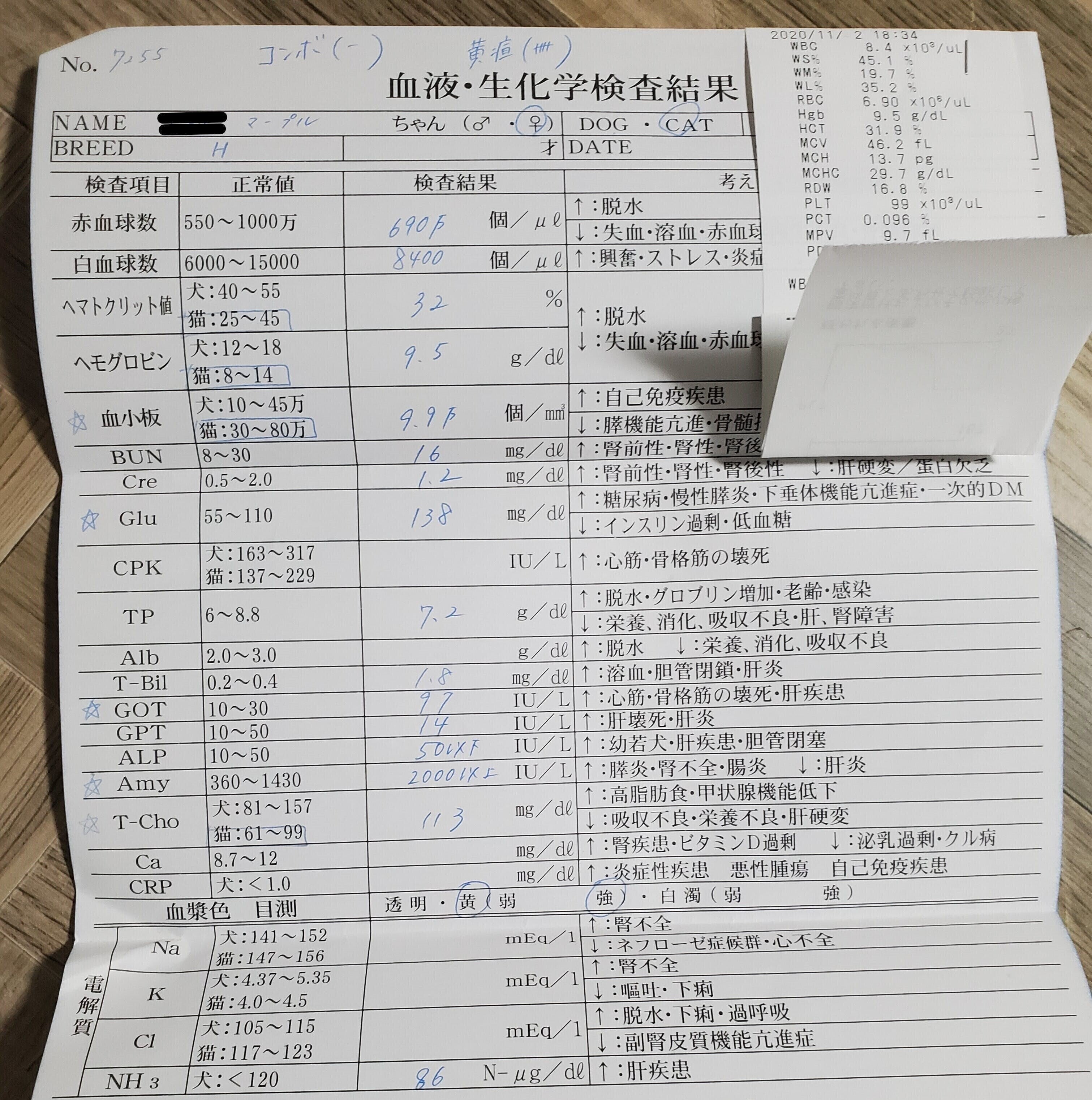 2020年11月1日 再び高熱。血液検査を実施。黄疸の数値が高かった。先生からFIPか三臓器炎の可能性があると言われる。 オゾンと点滴とステロイドを打って、三臓器炎の可能性を探る。血液をFIP検査の提出。