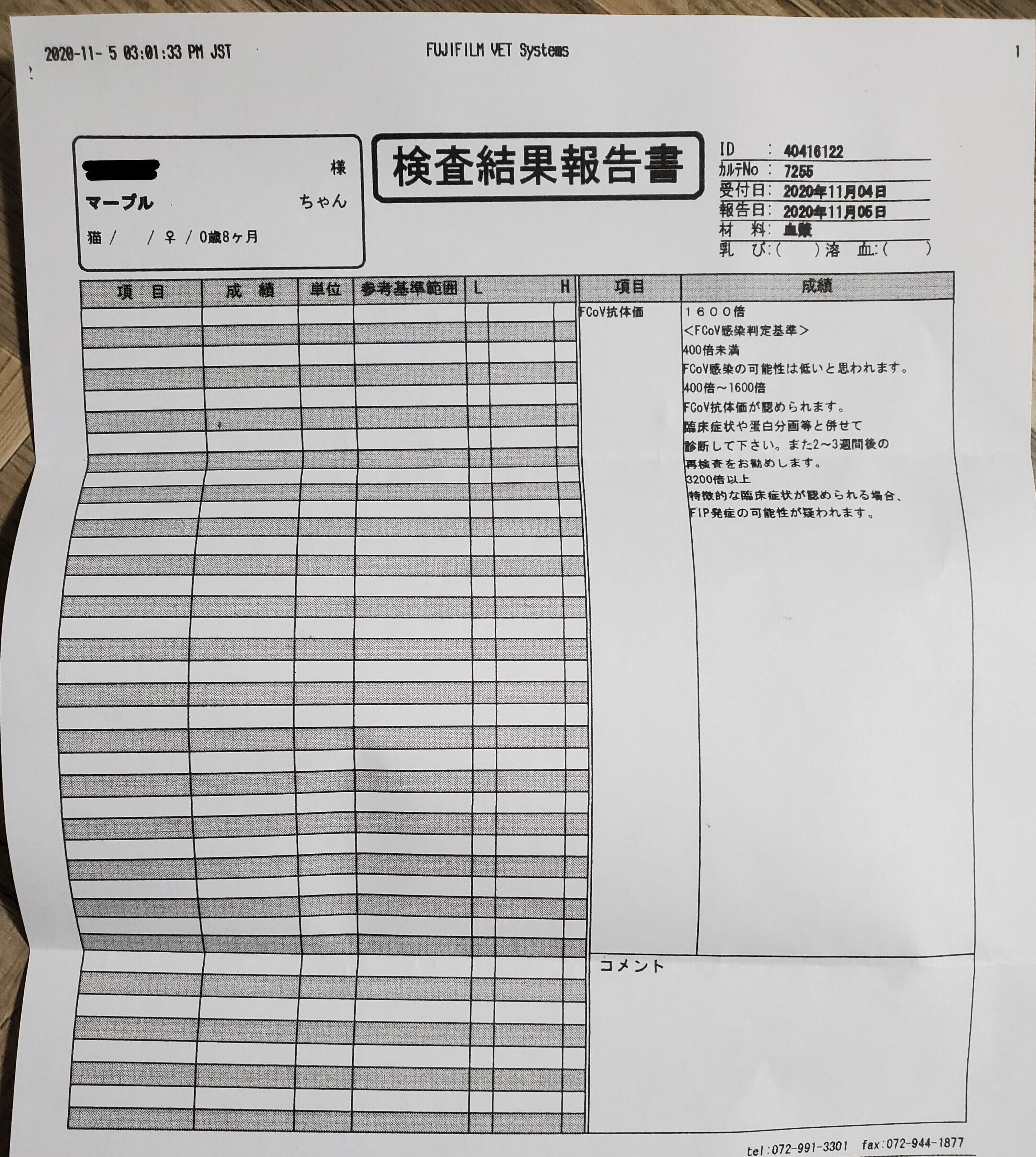 FIPだけは避けてほしいという願いは虚しく、2020年11月5日にFIPが陽性であると診断されました。