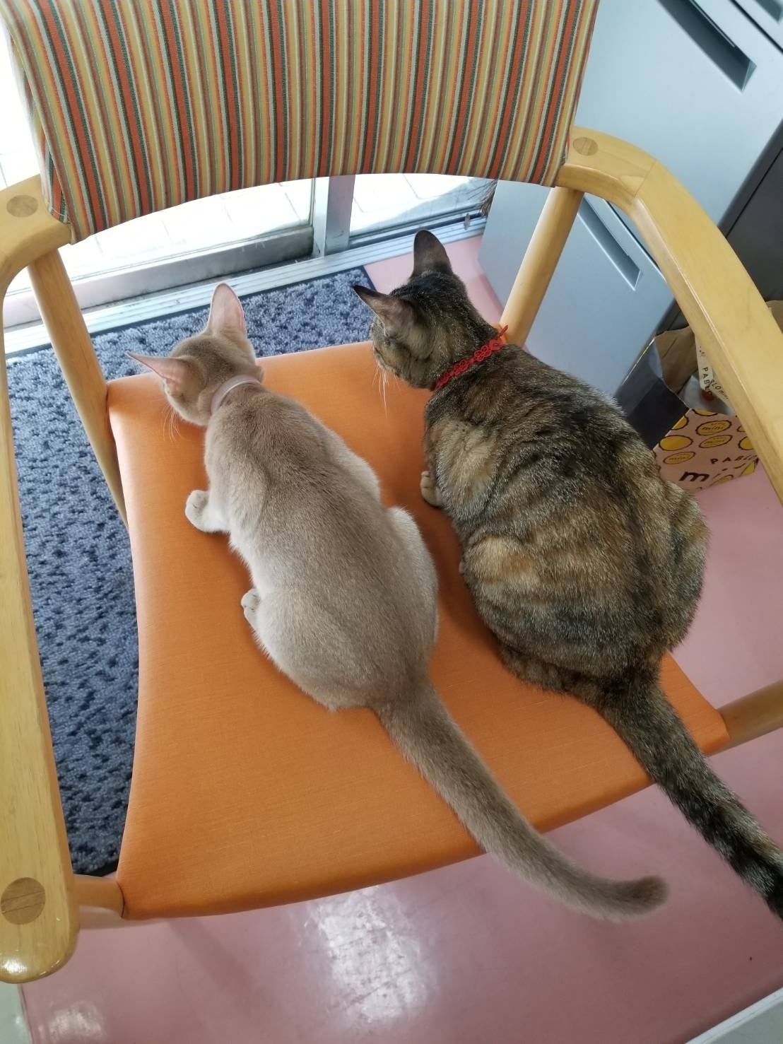 デイサービスにはもう一匹、スタッフの飼い猫のメリアちゃんがいて、マープルはメリアと大の仲良しです。