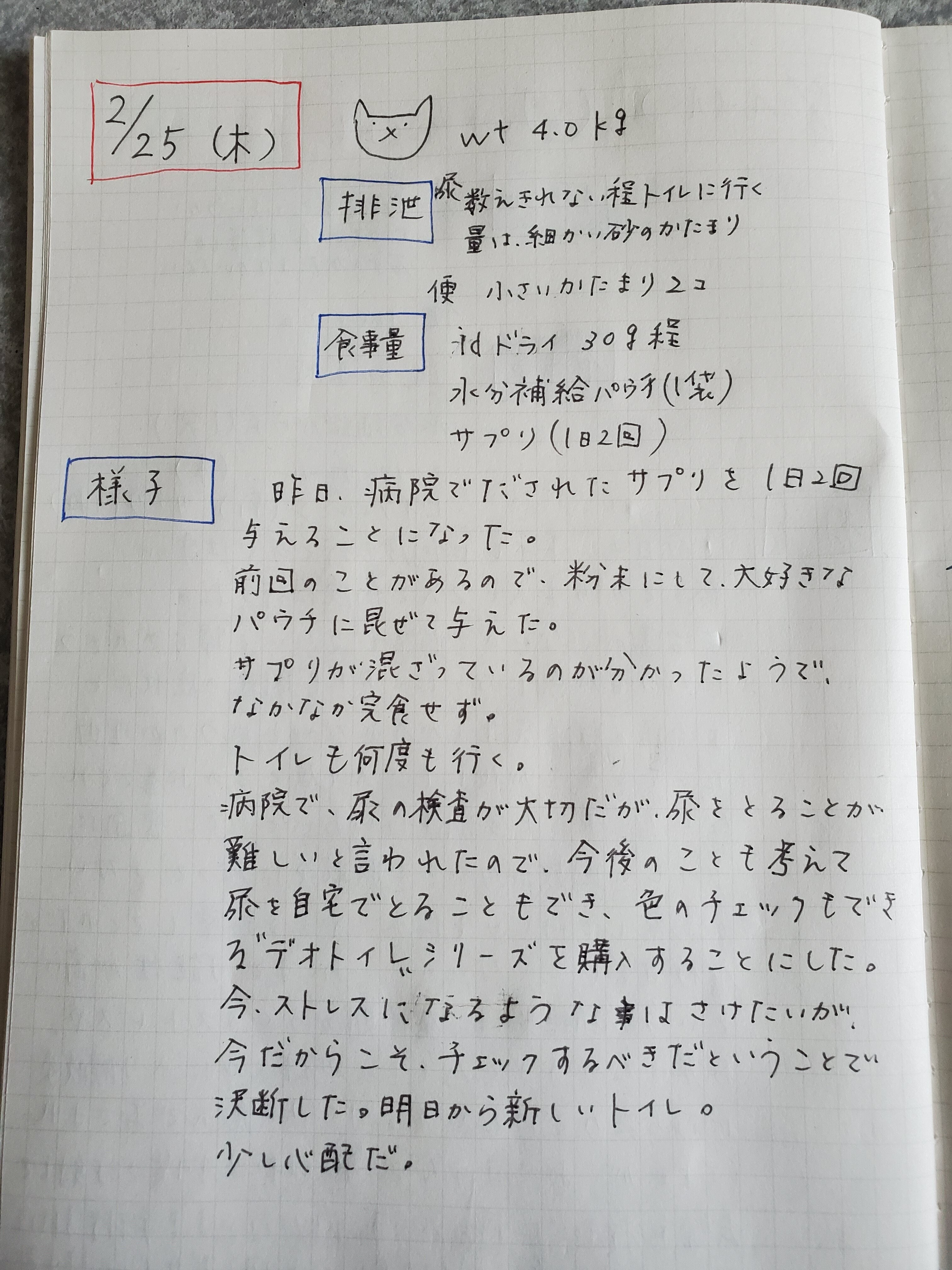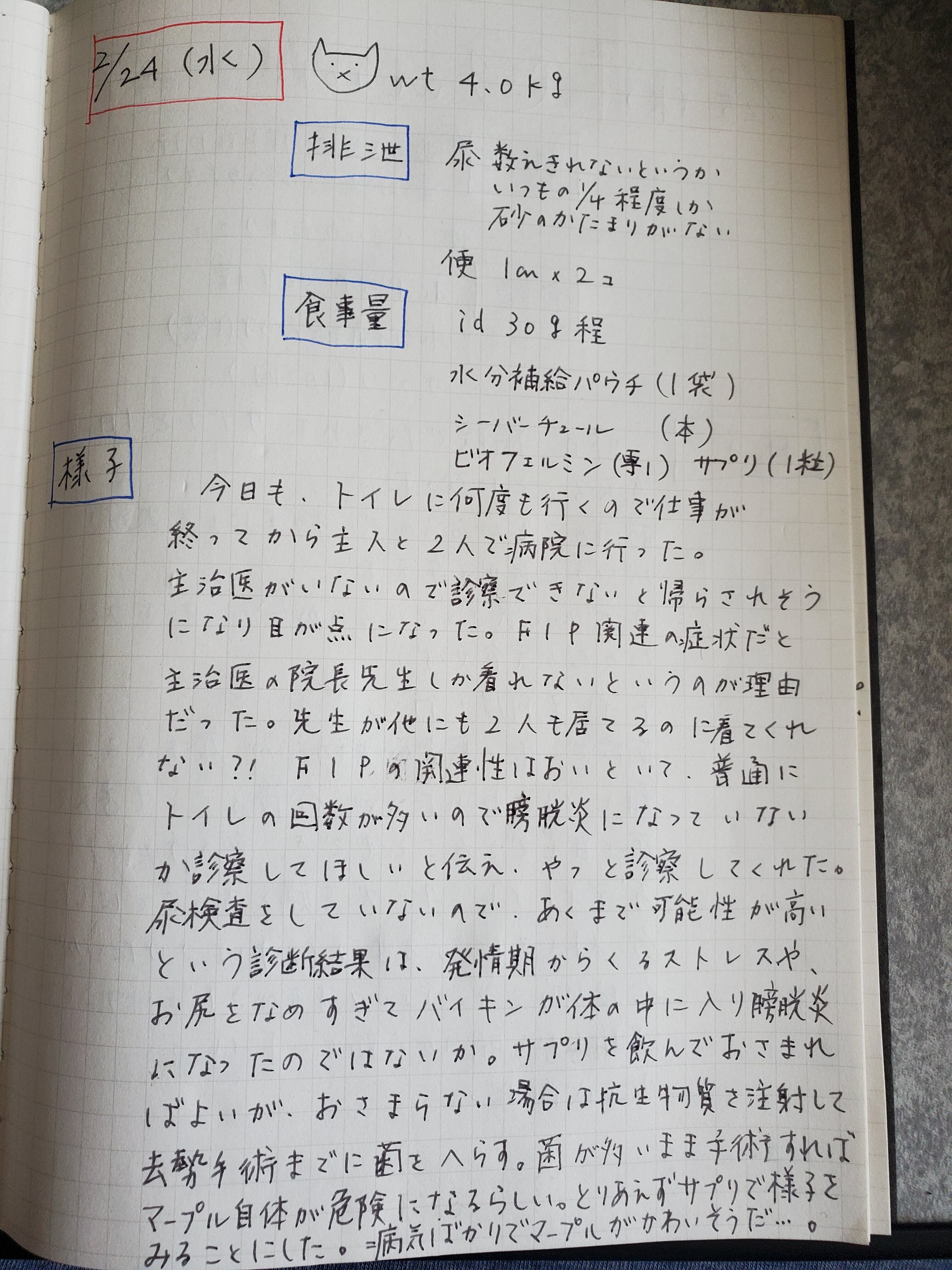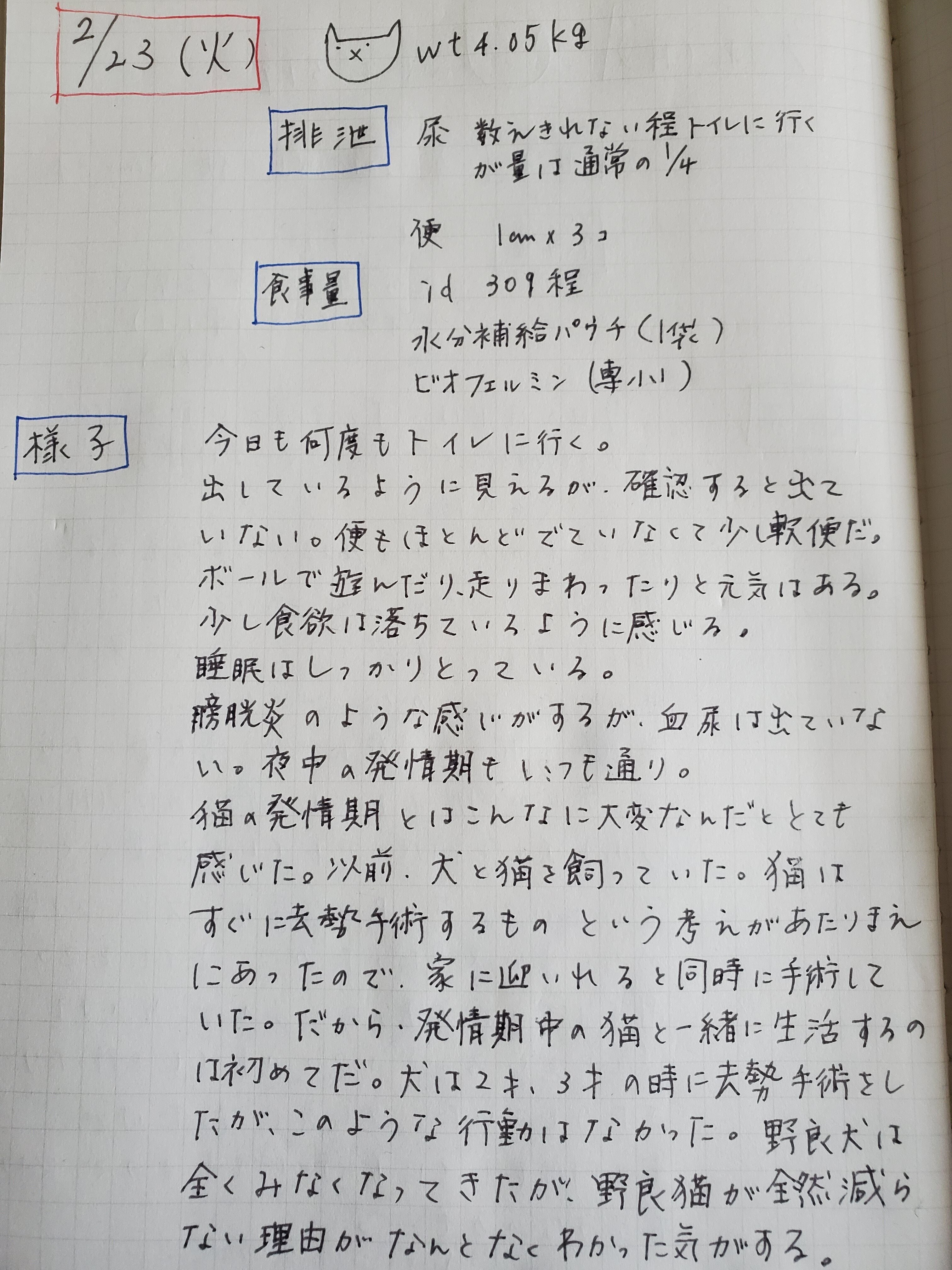先生曰く、おそらく発情期によく起こる軽度の膀胱炎じゃないかということでした。