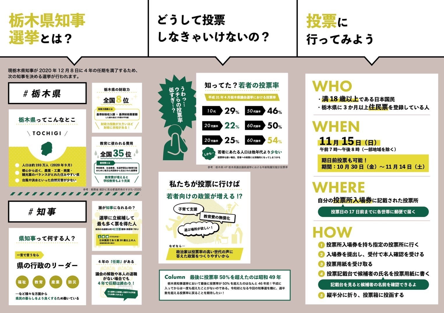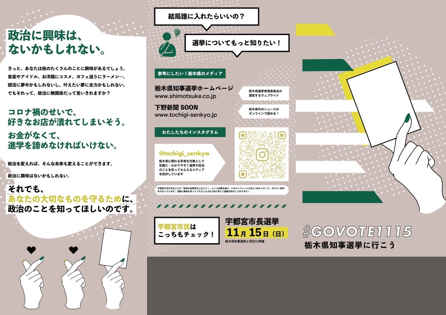 そこで、この「W選挙」での若者の投票率を向上させることを目標に、宇都宮市内を中心に、高校や大学、そして飲食店に投票にいくことを呼びかけるポスターやパンフレットを配布します。