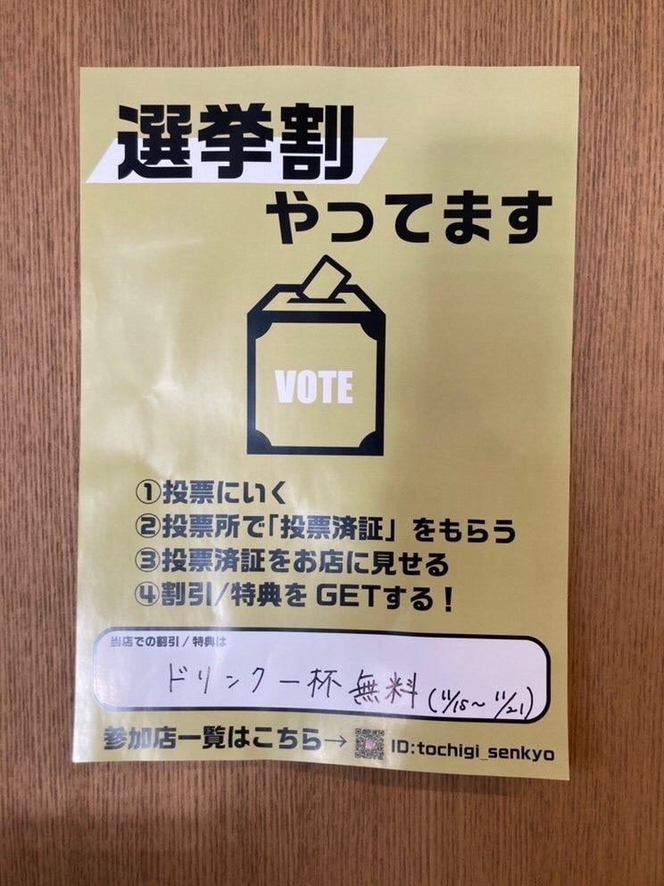 そして、選挙割(投票すると受け取れる「投票済証明書」を協力店舗で提示することで店舗ごとの特典や割引を受けられる)キャンペーンを行います。