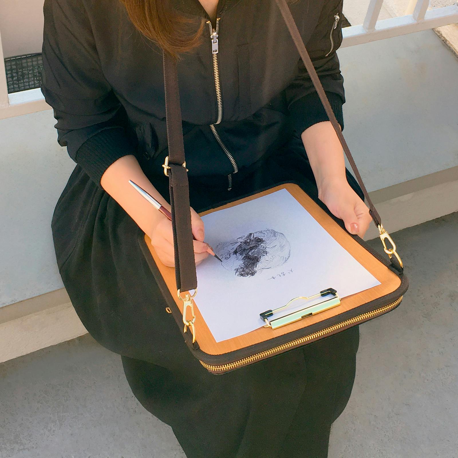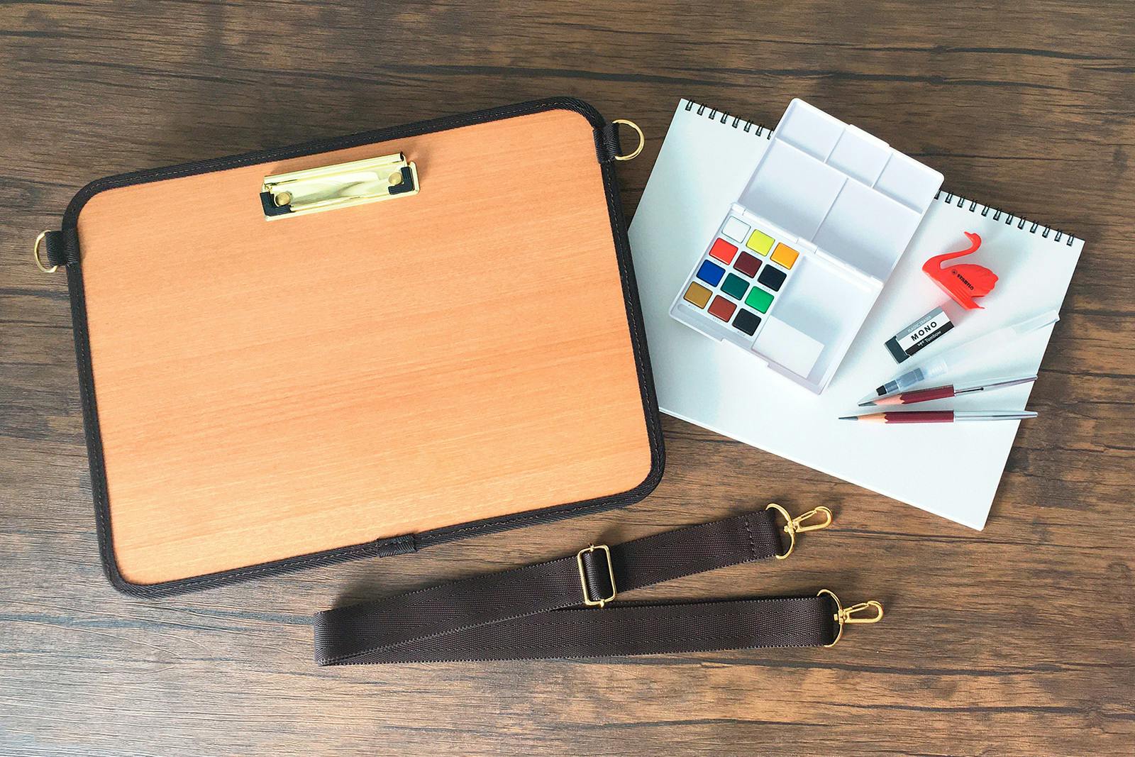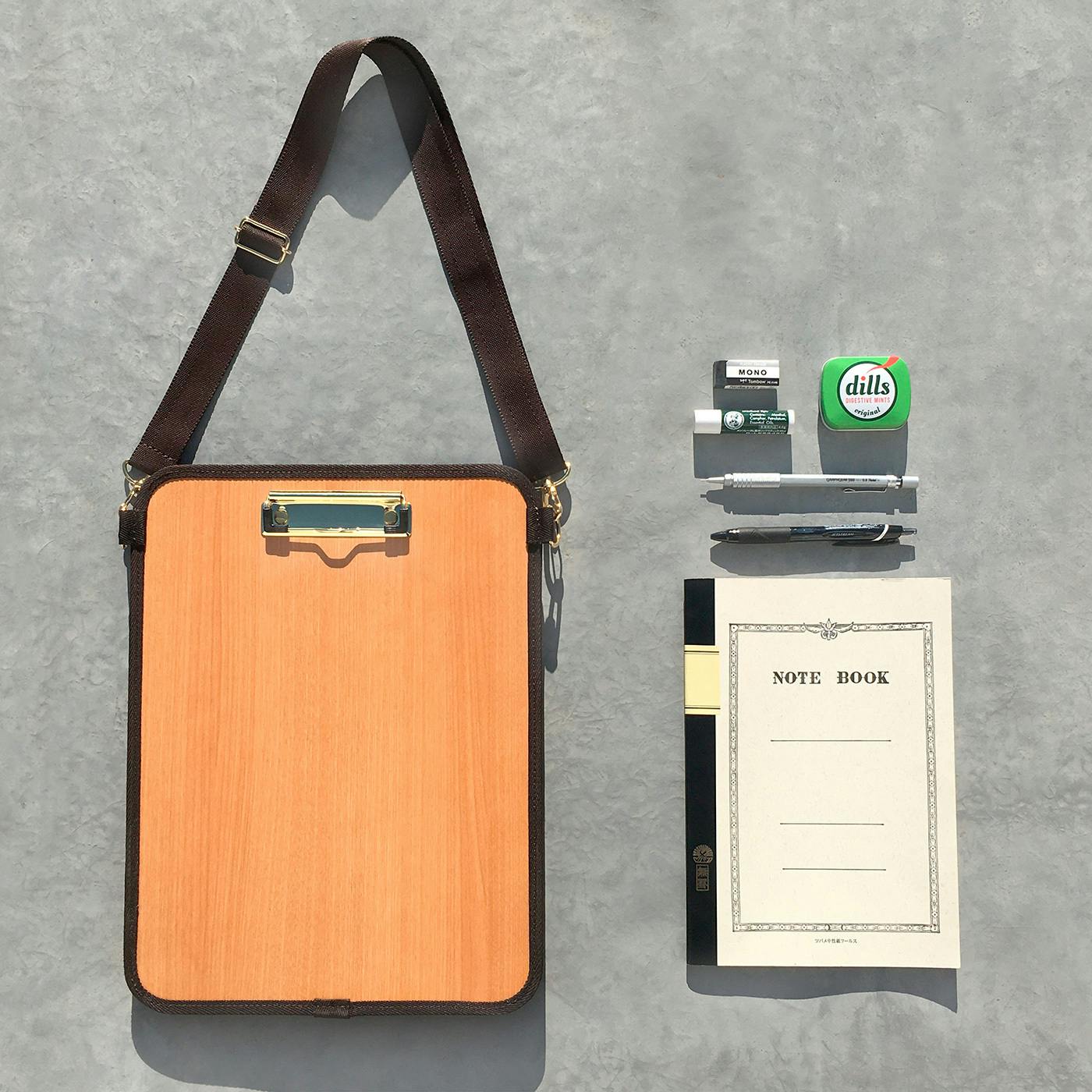 デスクのない場所で立ったまま読み書きができるアイテムで、博物館・動物園など屋外でのスケッチや、移動しながらの創作活動、図面やリストの確認などのシーンで便利です。