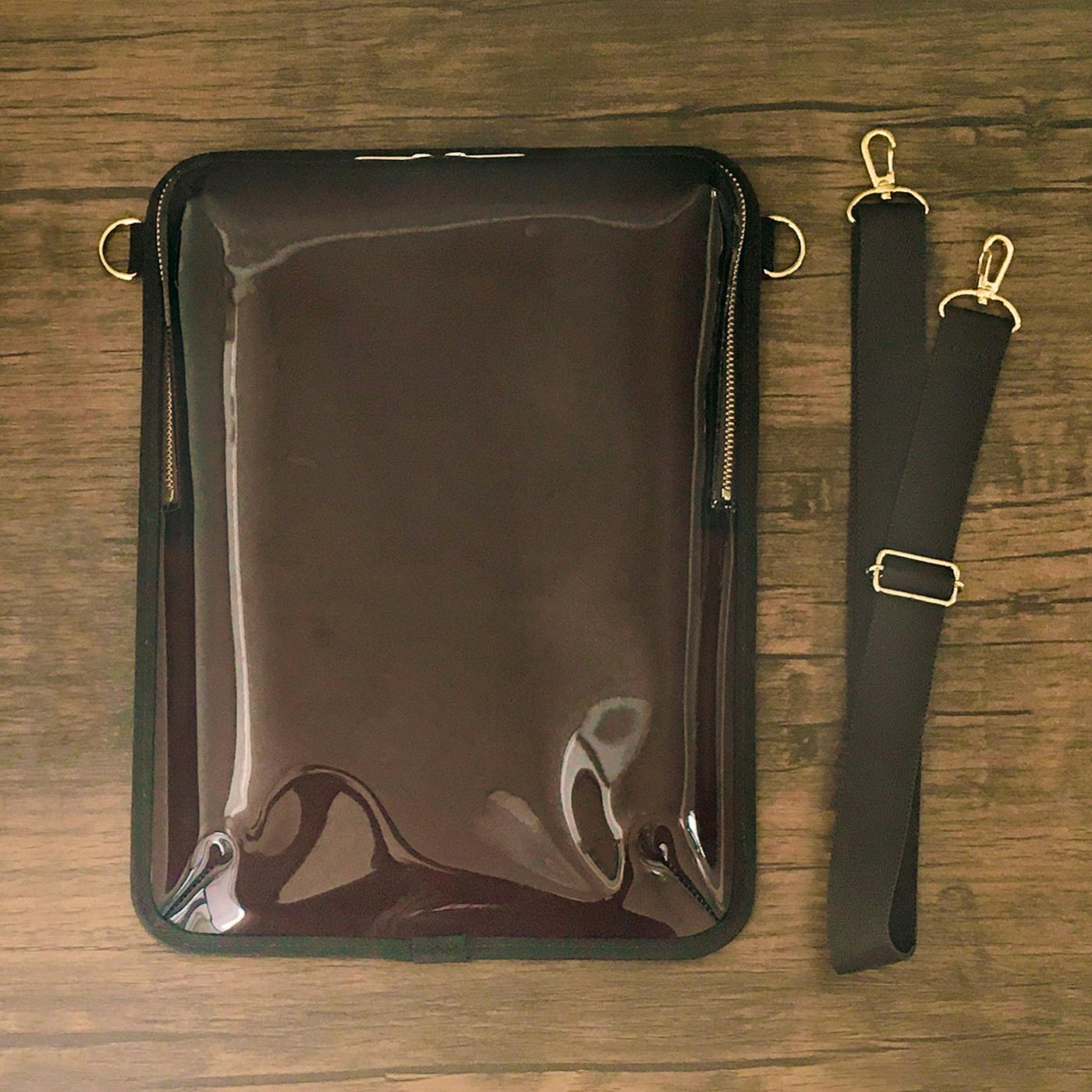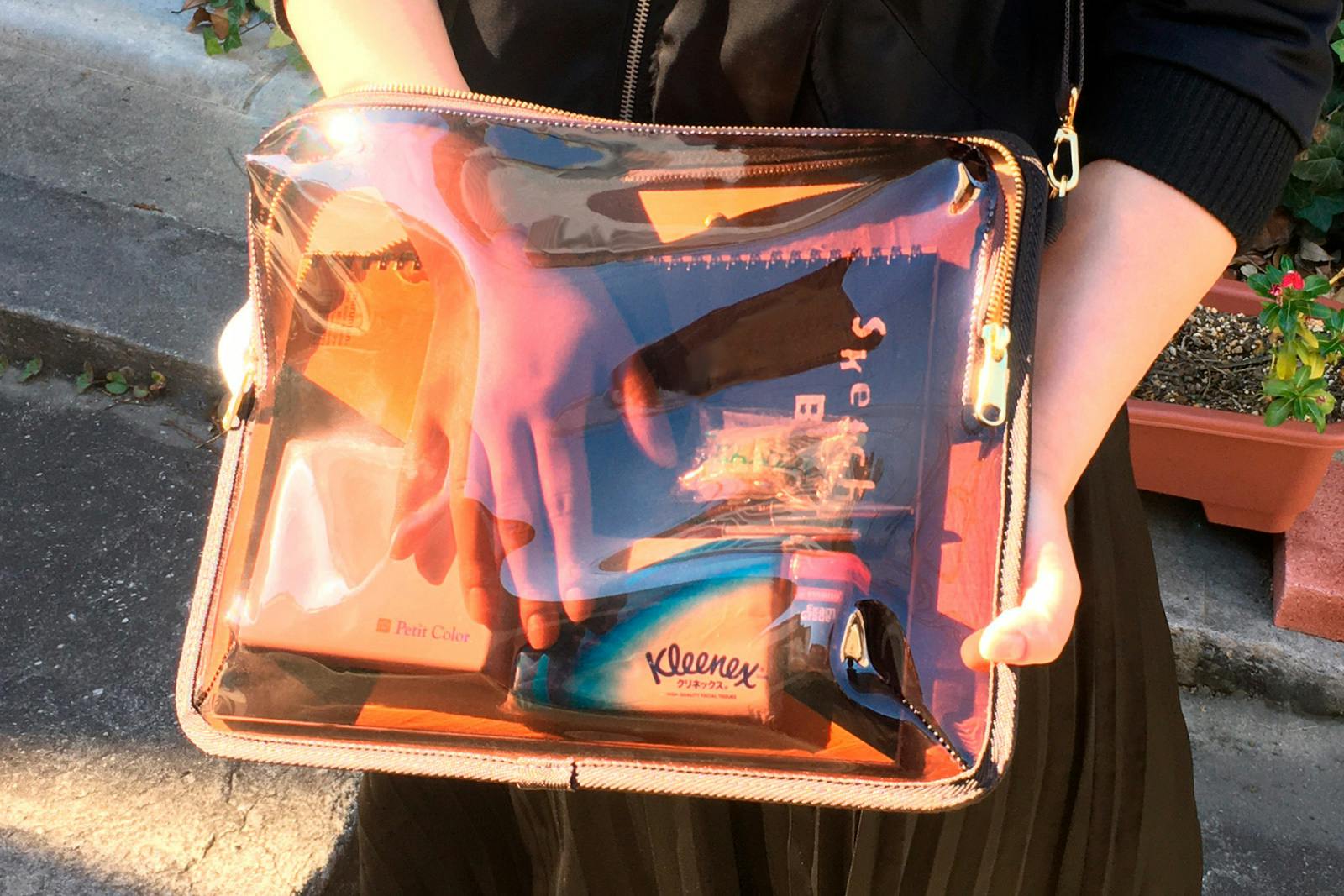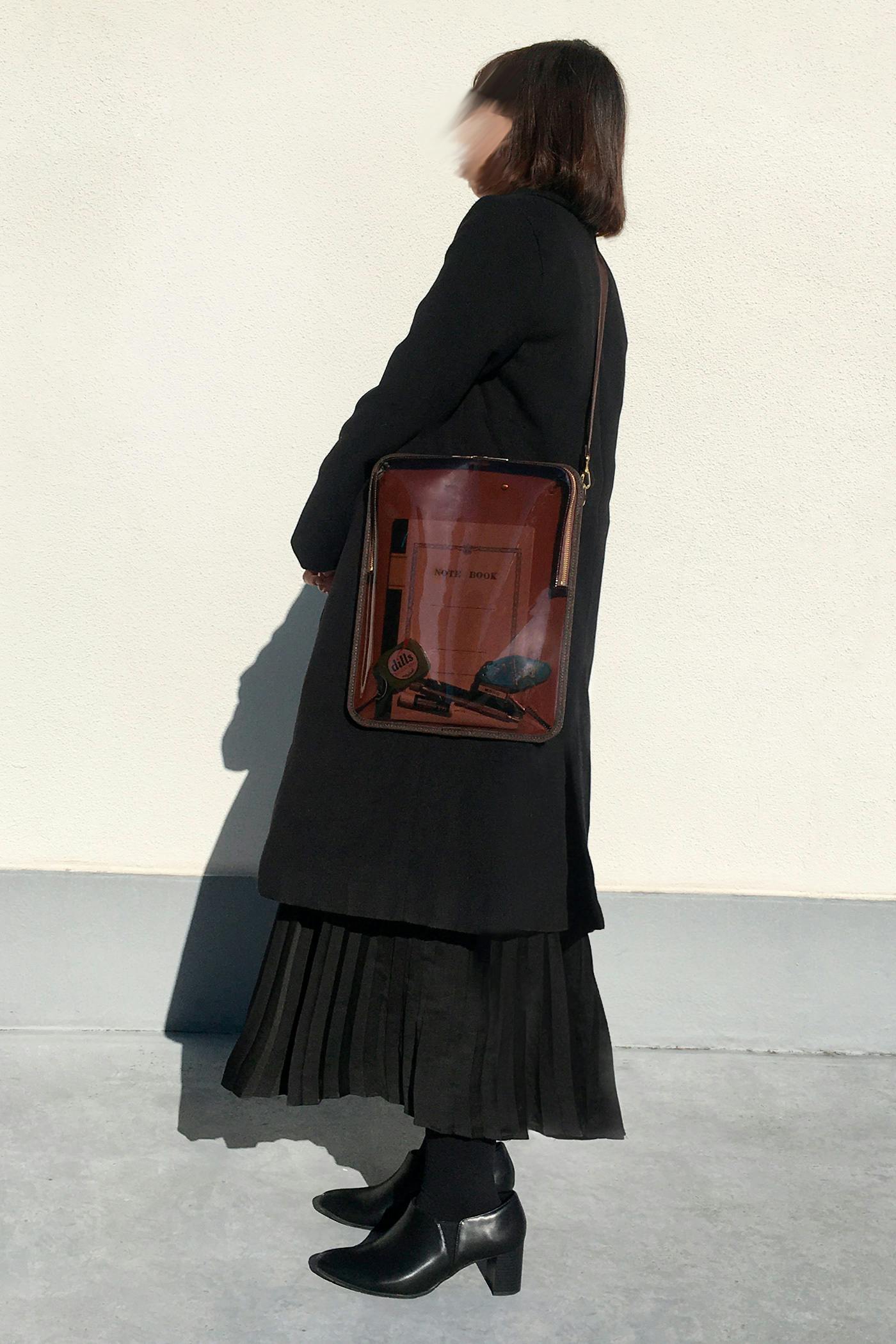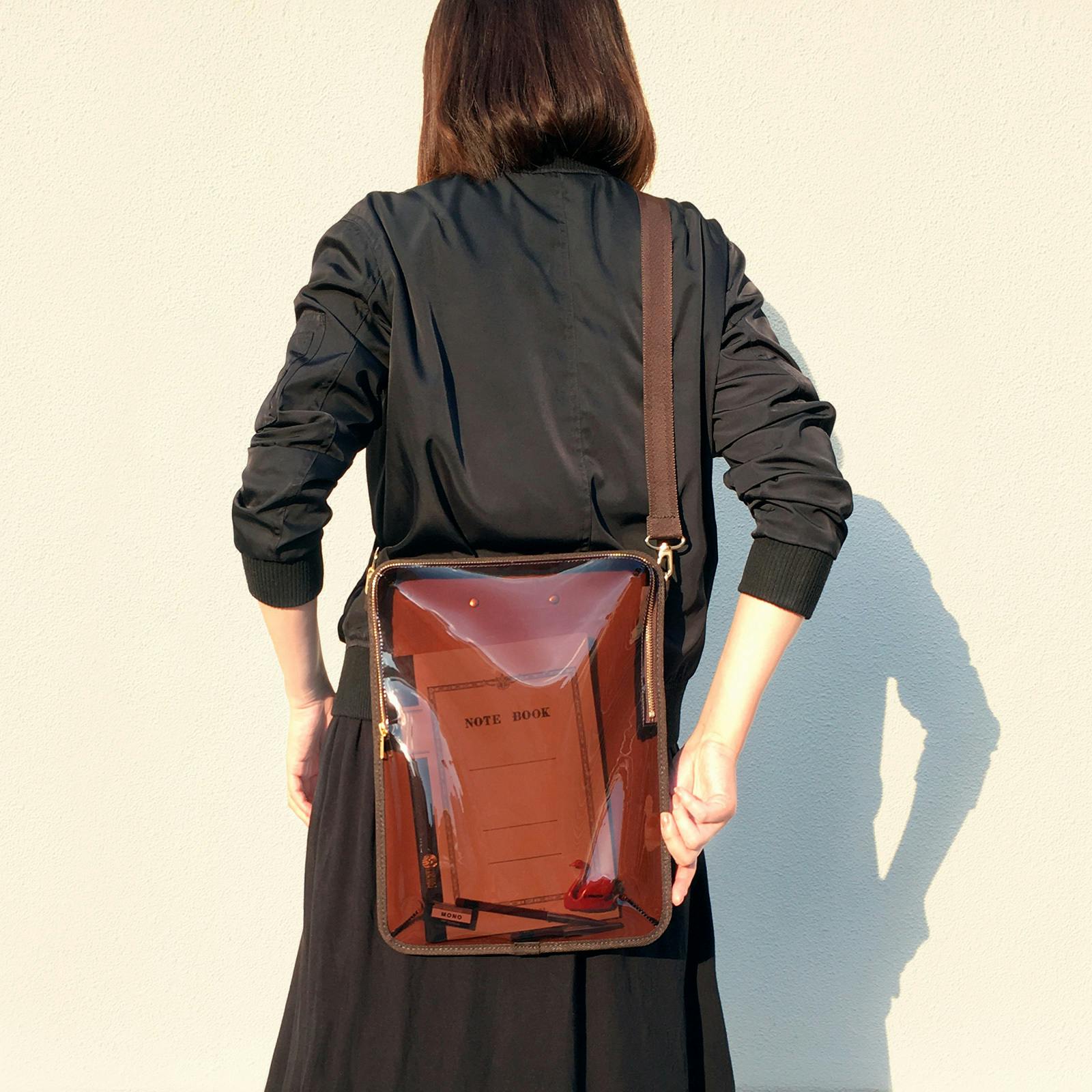 バッグ自体にしっかりとした大きさがありますが、クリア素材を使用しておりますので圧迫感が少なく、ファッションによく馴染みます。