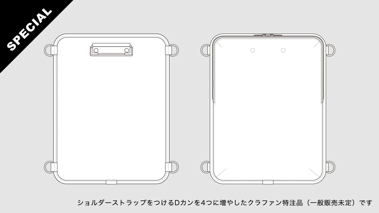 また、縦型のみショルダーストラップをつけるDカンを4つに増やしたバージョンを、特注Dカン追加縦型としてリターンにご用意いたしました。