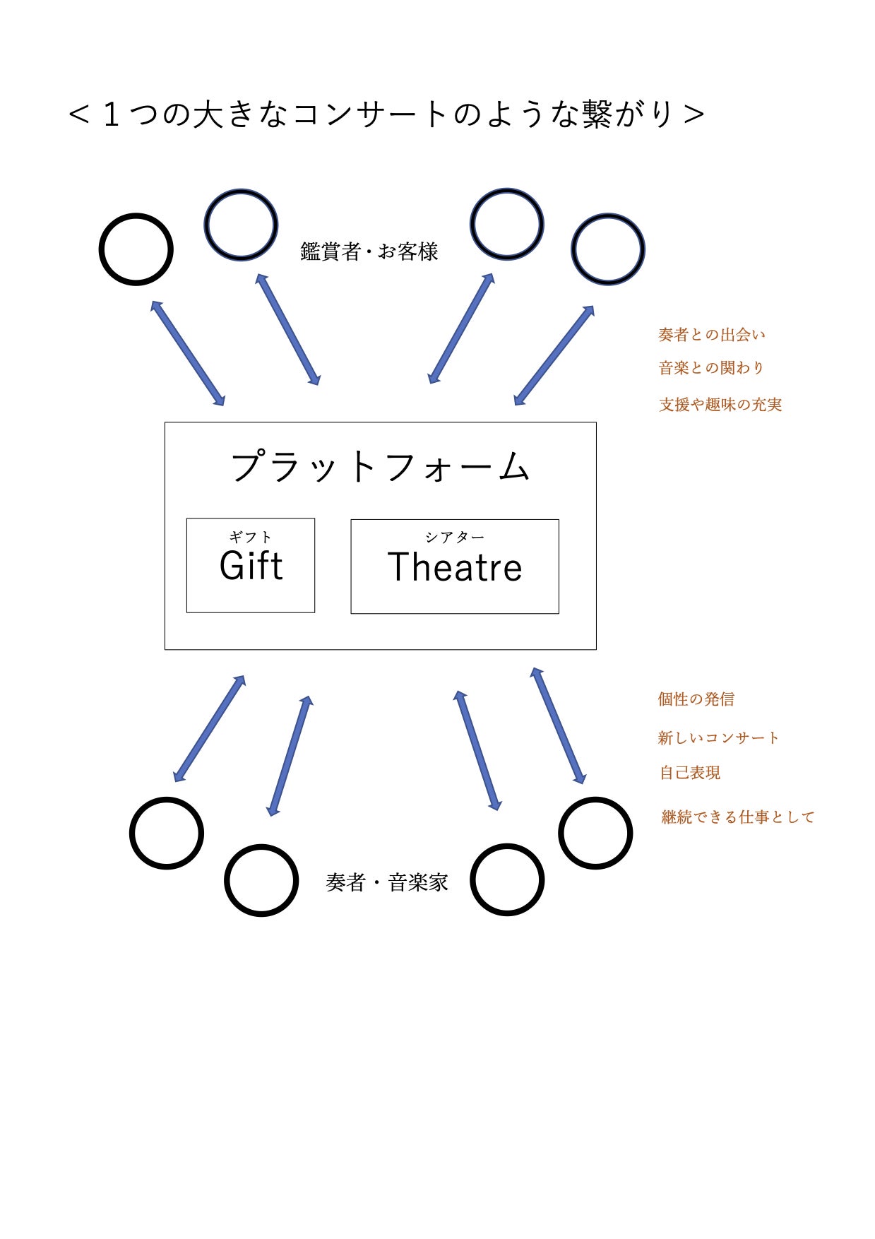 例えば、「家族や友達とも思うように会えない時、テレビ電話を簡単に繋ぐように奏者やコンサートに橋渡しすることができたら?」「人が集まるコンサートホールには行けないけれど、家族のお祝いや節目に音楽をプレゼントできたら?」このような、人が”音楽を聴きたい”という小さな欲求を奏者と一緒に叶えることができたらと。