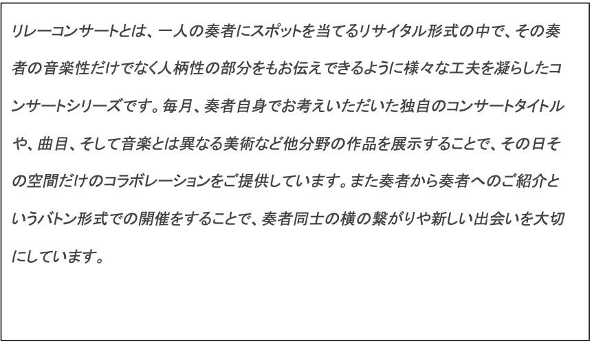 奏者の音楽性の根本とも言えるようなお人柄の部分を伝えるということが奏者自身、個性溢れる音楽、そしてリレーコンサートの魅力だと感じており、私たちの活動の大切な理念でもあるように思います。