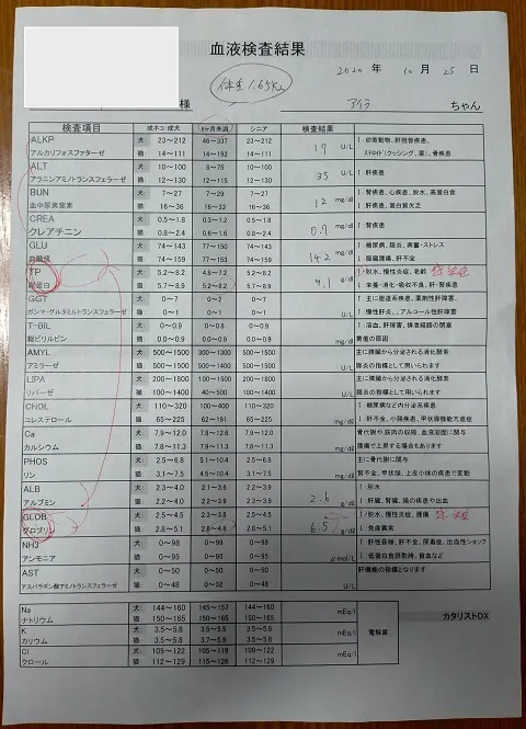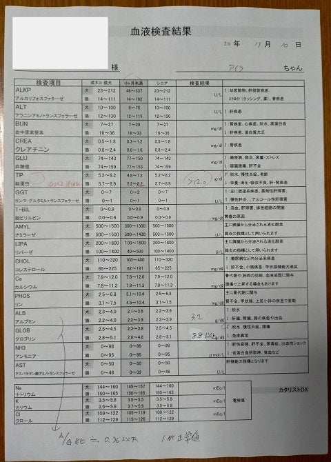 A/G比が0.36以下(1に近ければよい) とまだまだ改善しておらず、血液検査の数値は改善されている箇所もあるものの殆ど予断を許さない数値となっています。