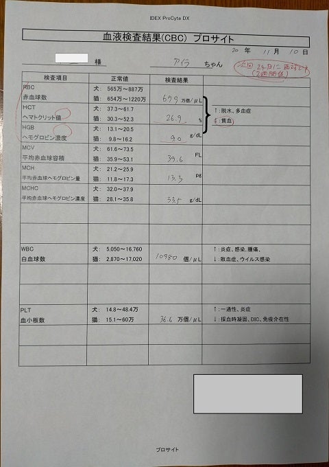 この時点では余命宣告1週間を宣告されてFIPウエットタイプ・後期と診断され、まだウェットとドライタイプの混合タイプとこの時は判明しませんでした。