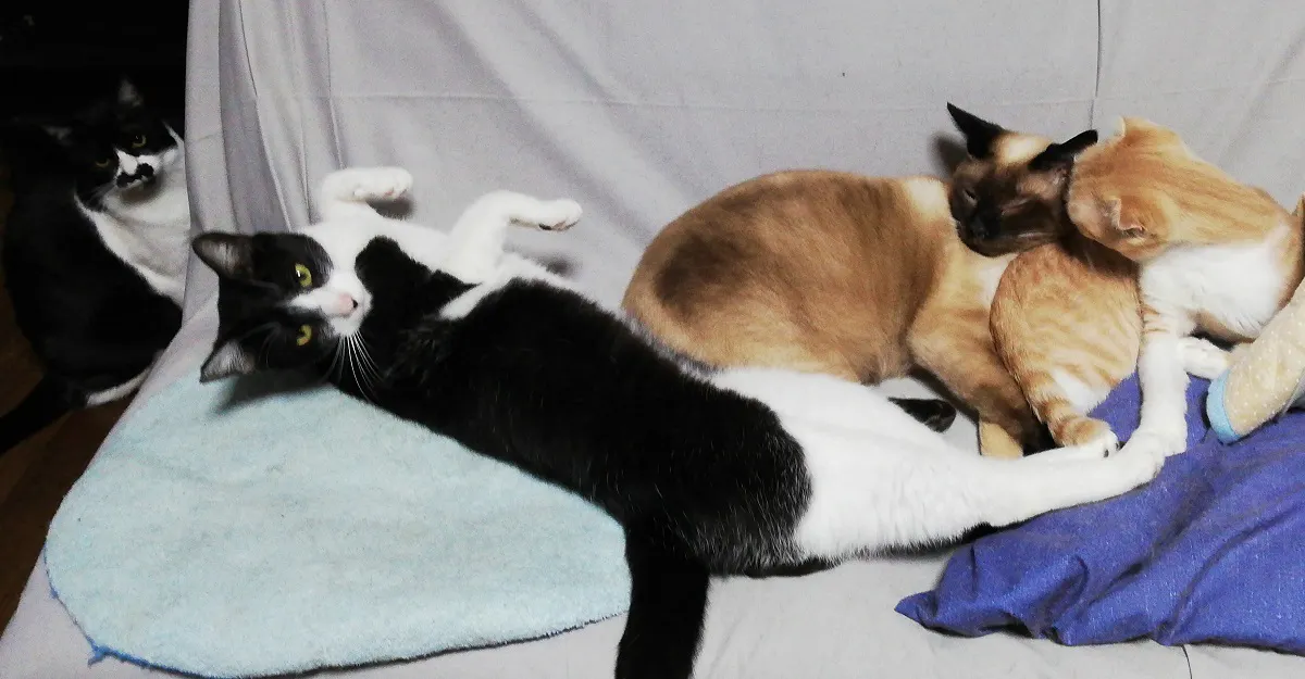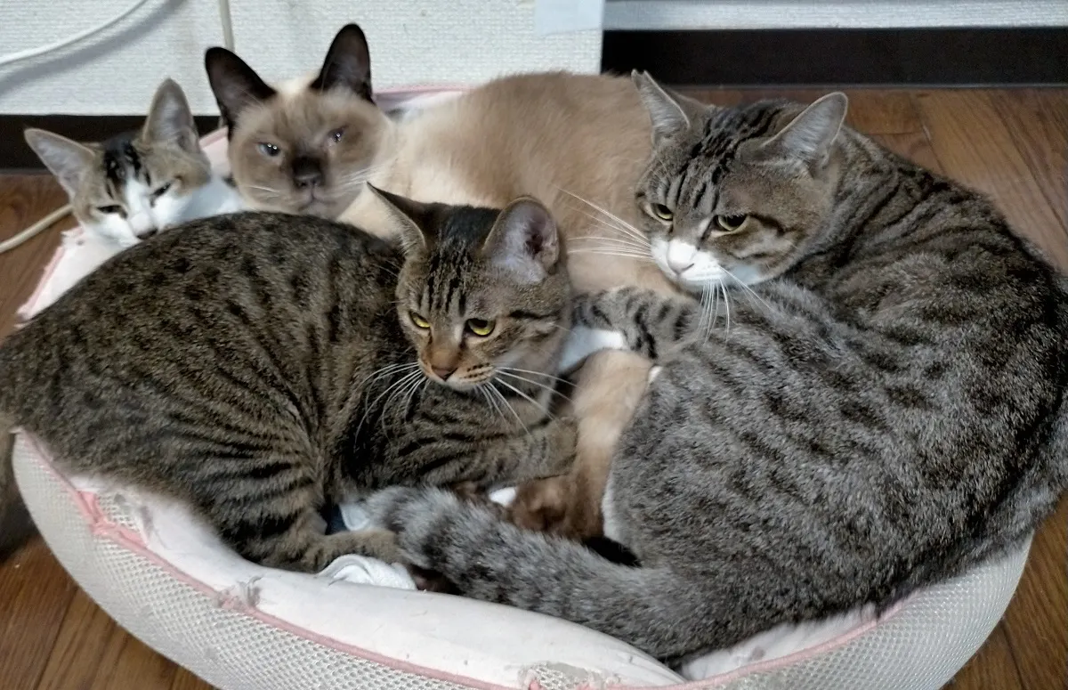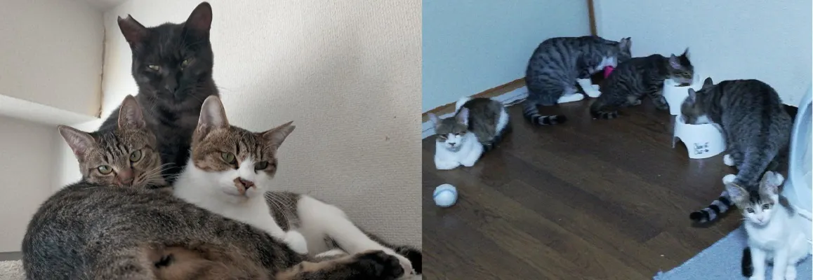 私は仕事をしながら、微力ながら1匹でも多く温かい家庭で暮らせるように保護猫のボランティアをしており、アイラを含め現在、保護猫8匹と元保護猫2匹と暮らしています。