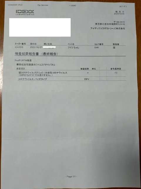 《後日届いた検査結果です。結果はFIP陽性でした》