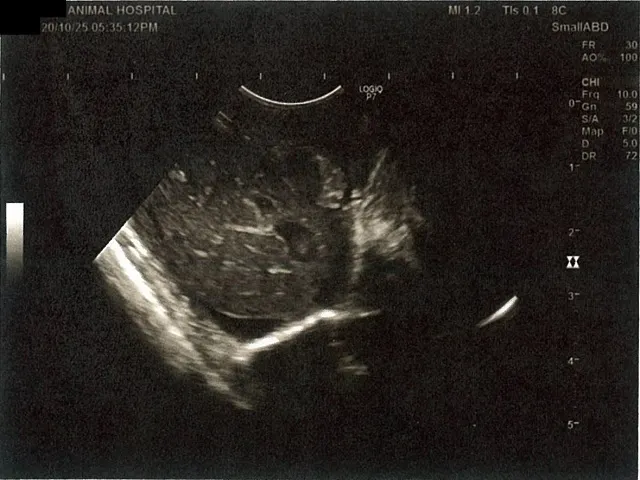 右腎臓周りに腹水が確認できるエコー写真