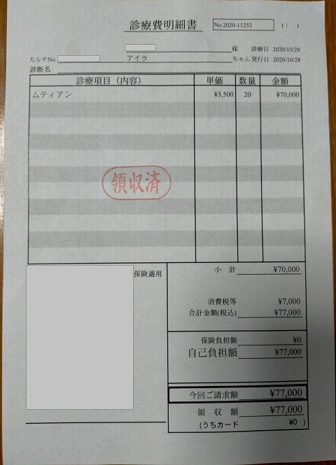 未承認の薬で理由はわからないがとても高額であり、現時点でFIPに有効な治療はムティアンだけで、他は対処方でしかない事を教えていただきました。