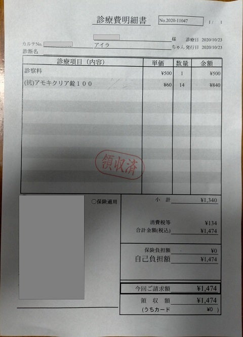 10月23日、風邪の症状が出て抗生物質を投薬します。