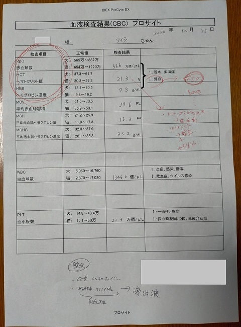 ヘマトクリット値が21.3%で20%を切れば造血剤の点滴と輸血が必要な状態で、