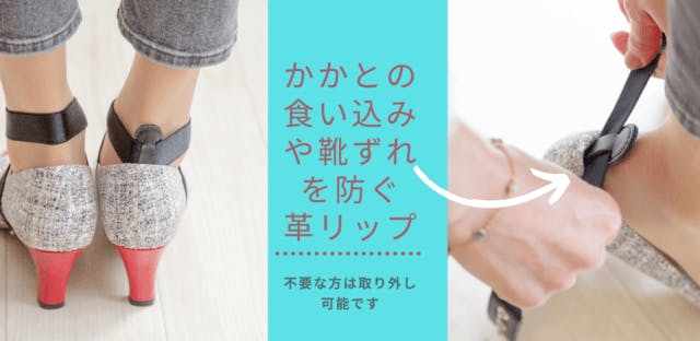 ✤かかとの靴ずれ防止の革リップは、つけ外しが自由です。不要な方は外しても使用可能です。