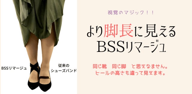 従来のシューズバンドは横に一本のラインが入るので 視覚的に足を太く短く見せてしまうのですが、<BSSリマージュ>の足首のクロスラインは脚を縦長キレイに魅せてくれます♪(写真は自社製品比較)