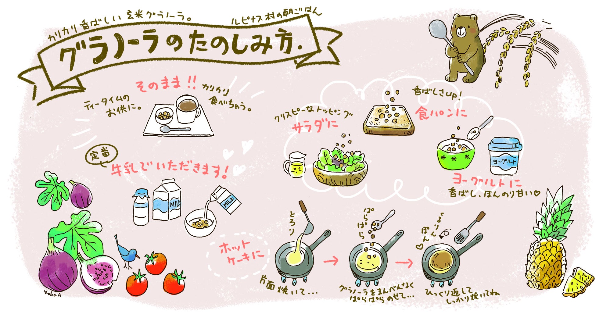 サクサクとおやつ代わりにそのままお召し上がりいただいても美味しいです。また腸内環境を整える発酵食品であるヨーグルトと味の相性が抜群に良く、ヨーグルトの苦手な年輩の方に喜ばれています。またアイスクリームのトッピングとしても、牛乳に浮かせてお食事代わりとしても召し上がっていただけます。私は休耕田を減らしたいという思いから農業を始め、日本人のお米離れが進むのを非常に残念に思っています。若い人達にも毎日もっとお米を食べて欲しいという思いから、近年若い人達に人気の《グラノーラ》とネーミングしました。お年を召された方々からは「懐かしい味」、若い方々からは「新鮮な美味しさ」と老若男女問わずご好評いただいております。現代の子供や若者が大人になったとき、この商品を通して玄米の味に懐かしさを感じてくれればと願っています。