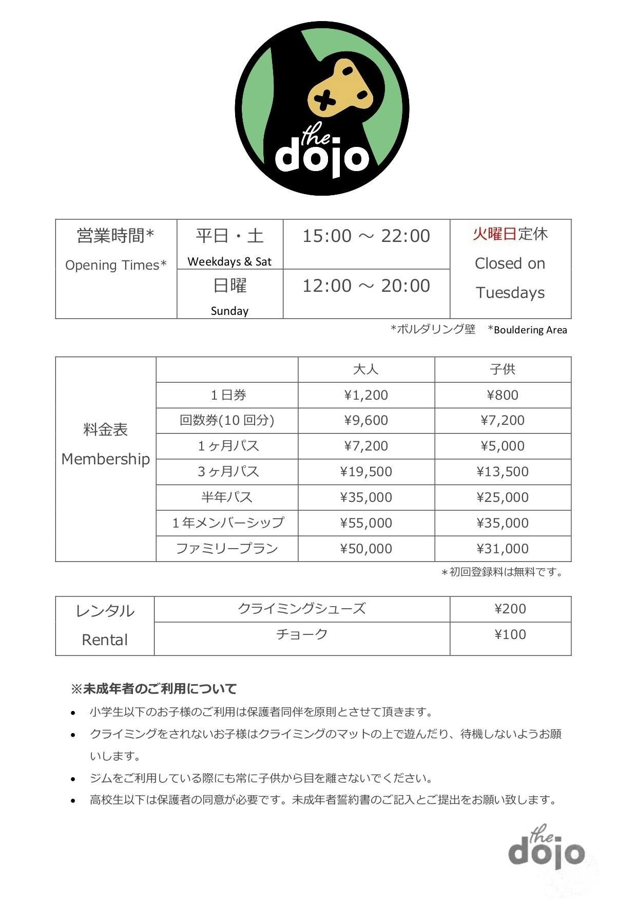 The Dojo Climbing は火曜日定休で営業を開始させて頂きます。