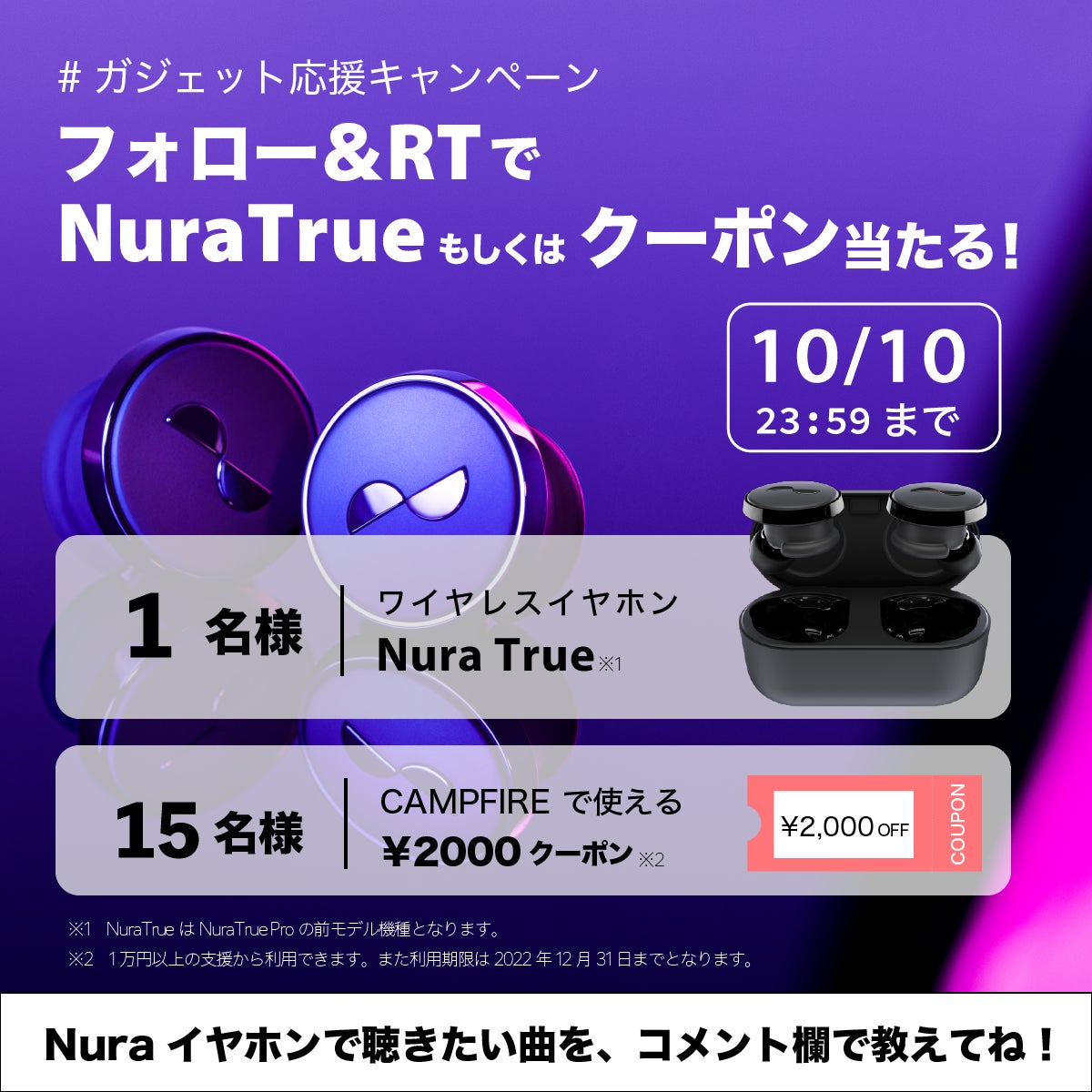 現在CAMPFIRE公式Twitterにて、Nura True Proの前モデル機種「Nura True」もしくはCAMPFIREでご利用いただけるクーポンが当たる、お得なキャンペーンを開催中です。