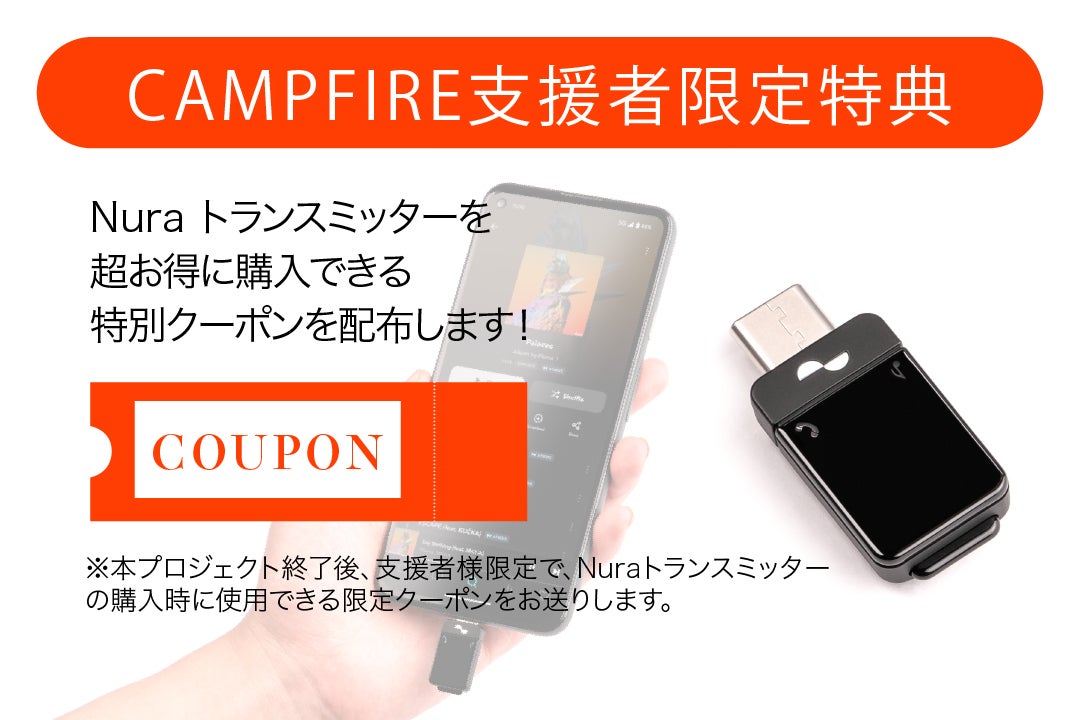 CAMPFIREでのキャンペーンにて、NuraTrue Proをご支援していただいた方皆様に、iPhoneやMacbookでも利用ができ一段とワイヤレスオーディオ体験が向上するNuraトランスミッターの特別クーポンをお配りできることになりました!