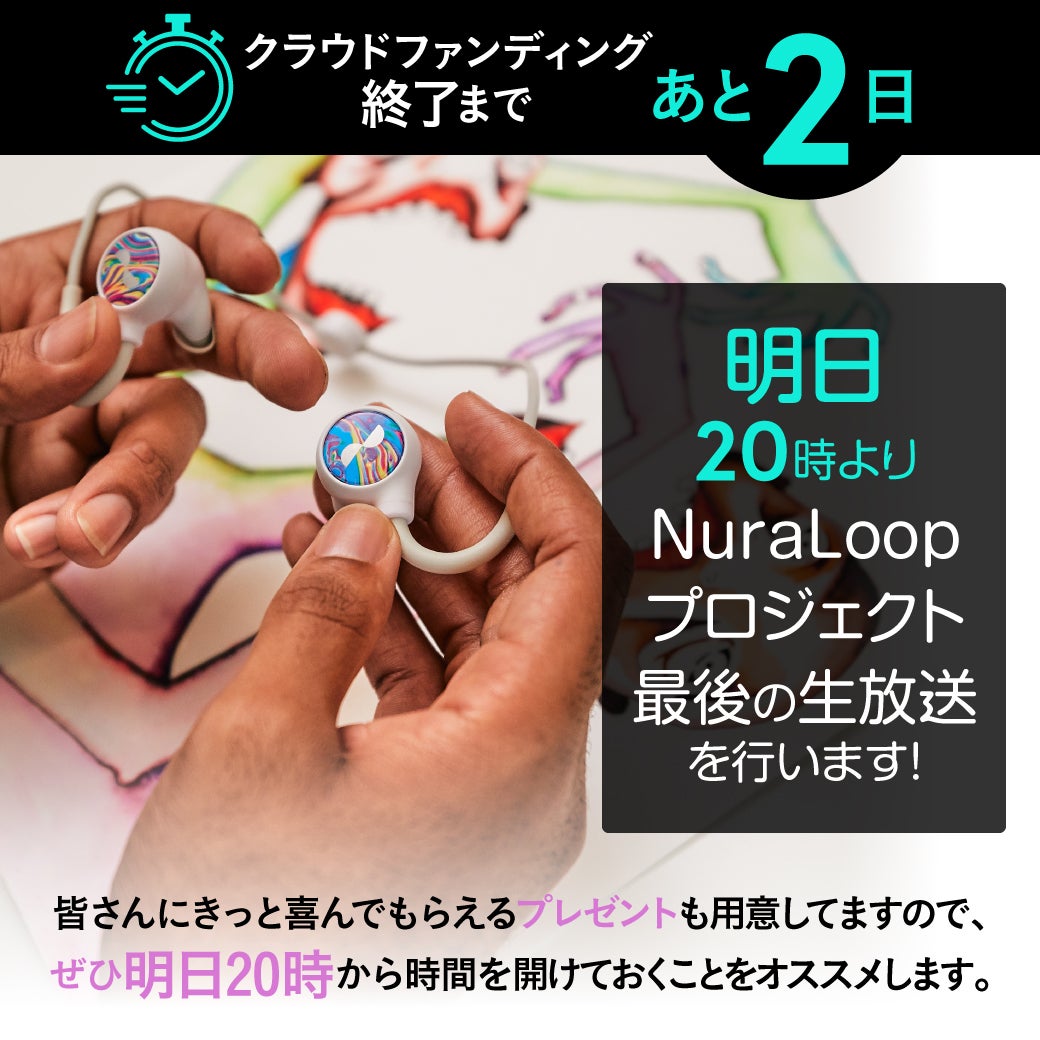 残り2日|二度と忘れられない”思い出”になること間違いなし!?いよいよ明日、NuraLoopにとって『最後のスペシャルLIVE』を開催します!皆さん、こんにちは!Nura teamのTaylorです!NuraLoopのクラウドファンディングも残すところ、あと2日となりました。多大なる熱いご支援、本当に感謝いたします。ところで皆さん、明日の20時から何があるか覚えていますか?そうです。NuraLoopの最後のLIVEが開催されるんでしたね!忘れてしまう前に、念のため、もう一度お知らせさせていただきます!最後の生放送は『明日の20時』放送開始です!カレンダーにメモを入れておきましょう。そして、昨日もお伝えさせていただきましたが、今回のLIVEは最後ということもあり、色々と盛り沢山の非常に濃密な内容となっています。参加された方全員が「LIVEに参加して良かった」と心から思っていただけるような忘れられない最高のライブになることを約束いたします。そして、今回のプレゼント内容について気になる方も多いかと思いますので、その詳細をお伝えさせていただくと、、、プレゼント内容は、ズバリ、『日本では、まだ誰も手に入れることができない特別限定版のNuraLoop Limited Edition』です。ちなみに、このNuraLoop Limited Editionは今日本では手に入れることのできないレアなものとなっております。海外では先日リリースされたばかりの新商品で、耳に装着する部分のマーブルカラーが一人一人違っているという点が特徴的な商品です。一人一人違うデザインが施されているので、世界に一つだけのNuraLoopと言えます。プロダクトが自分専用で、もりろん音も自分専用。まさに新時代にヒアラブルデバイスとなります。そんな、NuraLoop Limited Edition を明日のLIVE視聴者の方にプレゼントさせていただきます!支援している方、支援していない方問わず、全員にチャンスがありますので、楽しみにしていただければと思います。プレゼントの応募方法については、追ってご連絡させていただきますね。さらに明日のLIVEは、NuraLoopの支援を迷われている方にとって、支援されるかどうかの決め手となるような内容になっているので、支援を検討されている方こそ見逃さないようにしてくださいね!もしNuraLoopに関する質問等がございましたら、まずはコチラをご覧ください。それでも解決されない場合は、NuraLoop公式LINEから直接ご質問をくだされば、担当スタッフが丁寧に対応させていただきますので、ぜひご活用ください。それでは引き続きSNSなどでシェアしていただいて、最後までNuraLoopを応援してくださると嬉しいです!明日のLIVEで皆様にお会いできるのを心から楽しみにしております。それでは!TaylorFull Color Sound Support The Nura Team