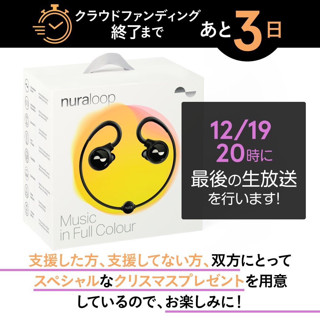 残り「3日」|参加者”全員”にチャンスがある!特別なクリスマスプレゼント付きの『最後のLIVE情報』をお届け!こんにちは!Nura teamのTaylorです!NuraLoopのクラウドファンディングも、ついに残り3日となってしましました。こうして皆さんにメッセージを送る事ができるのも、あと何回あるのだろうか...と考えると、なかなか寂しいものですね。ですが現在、その寂しさを吹き飛ばすような凄まじい勢いでNuraLoopの支援が盛り上がってきています!そこはチームのみんなとても嬉しく思っています。実際に、皆様の応援が「支援」という形で数字として現れ、とんでもなくヒートアップしているのを肌で感じました。その勢いと熱さは、クラウドファンディング終了が刻一刻と近づくにつれ、ますます強くなっている印象です。そして、おかげさまで、NuraLoopを支援してくださる方も1850名を超え、その支援総額も3700万円を突破しました。本当に、皆様へ「ありがとう!」と大声で伝えたい気持ちです。そこで今回、、そんな皆様への感謝の気持ちを込めて、タイトルでも告知させていただいた通り、『12月19日20時』より、NuraLoopにとって最後となるLIVEが開催される事になりました!やはり最後となるので、皆様との思い出になるような最高のLIVEにしたいと強く思い、支援の有無に関係なく、参加された誰もが笑顔になるようなスペシャルクリスマスプレゼント企画も実施させていただきます!(ここだけの話ですが、今回のプレゼントはかなり特別な物です。日本ではまだ手に入らないNuraの新製品です...)そして、LIVEに参加した皆様が「NuraLoopを支援して良かった!」と心から思っていただけるような、魅力溢れる非常に濃いライブ内容となっていますので、是非お時間を空けて見ていただければと思います。残り3日となりましたが、引き続き最後までNuraLoopを応援してくださると嬉しいです!それでは!TaylorFull Color Sound Support The Nura Team
