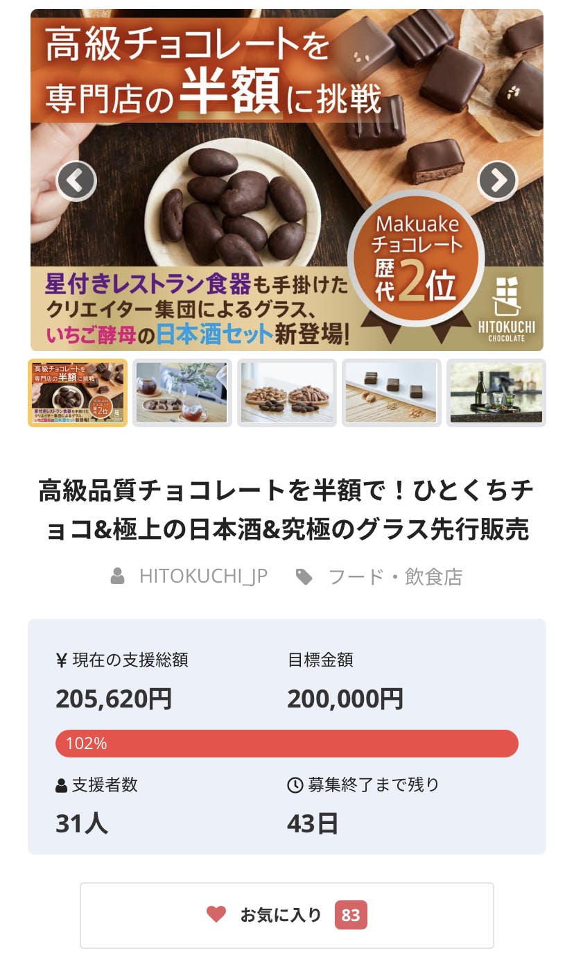BOOSTERで開催中の、「高級品質チョコレートを半額で!ひとくちチョコ&極上の日本酒&究極のグラス先行販売」プロジェクトで、本日目標金額20万円を突破することができました!