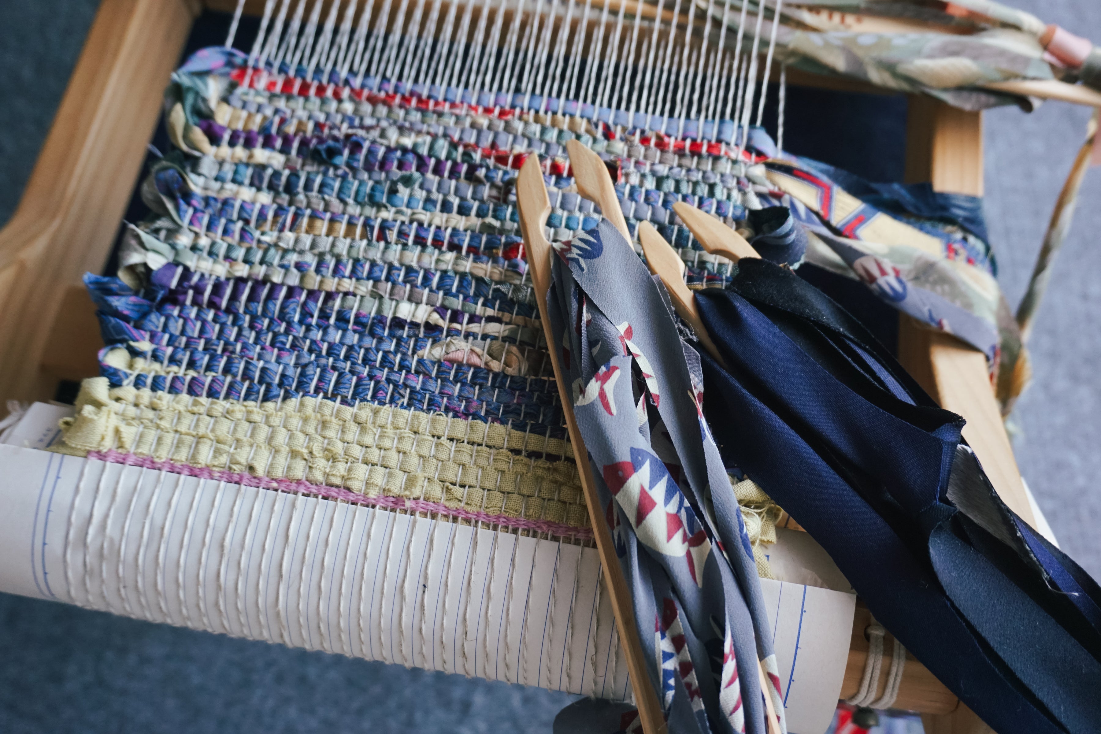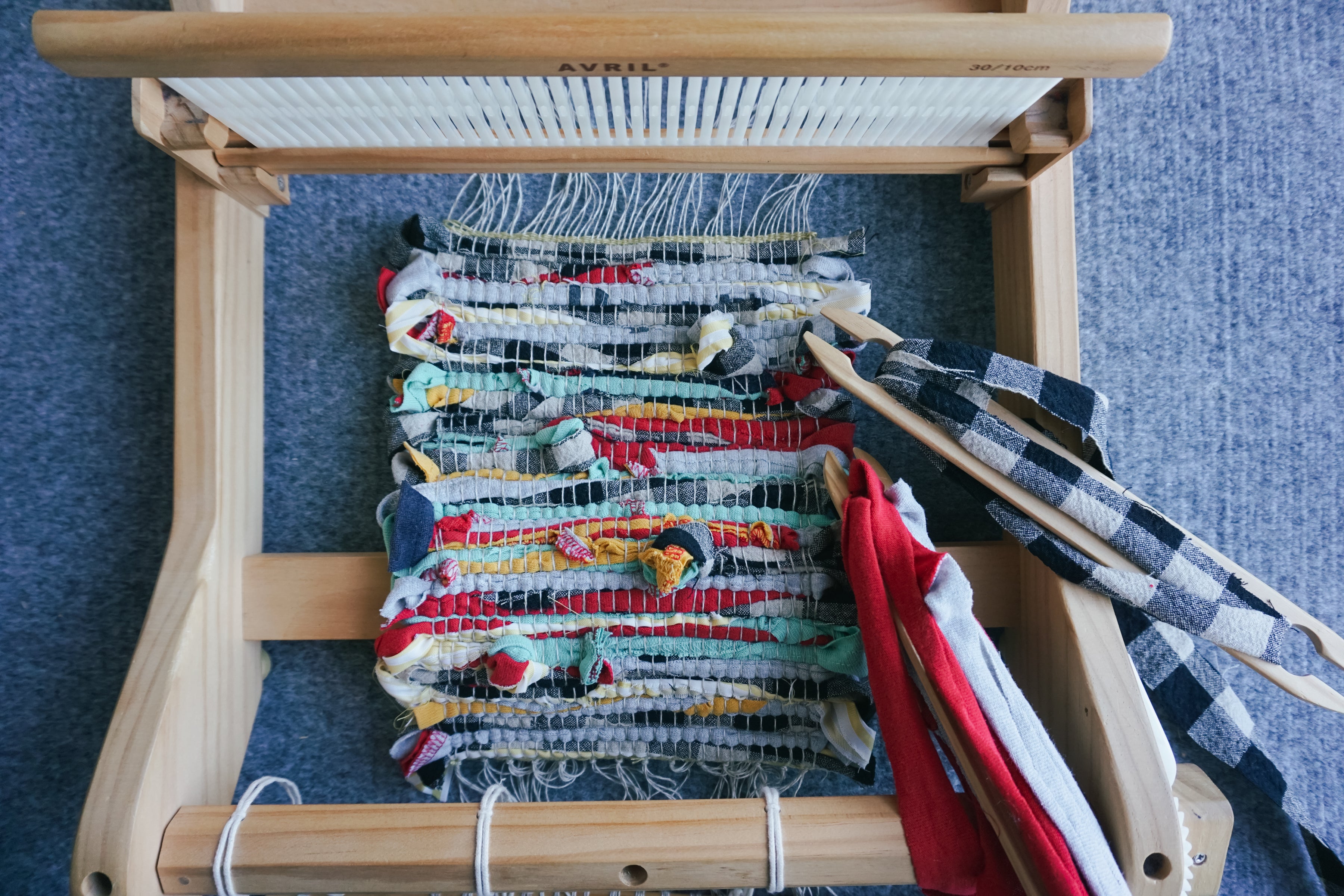 想い出の布をふんだんに使った裂織りで仕上げていきます。