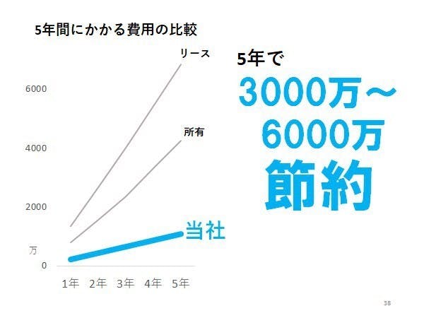 下のグラフ(スーパーカー2台に対してかかる費用比較)をみていただくとわかるように、リースや所有と比較してかかる費用が一番抑えられるのも魅力の1つです。