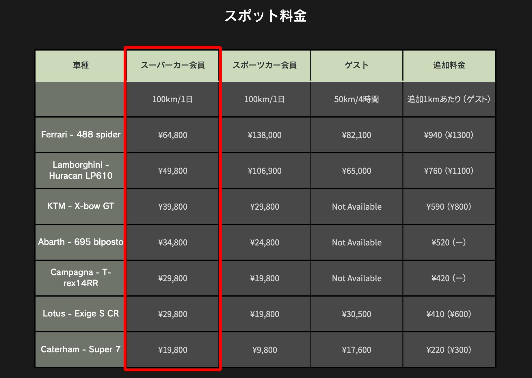 ↓こちらは、スーパーカーの1日分のスポット料金表です